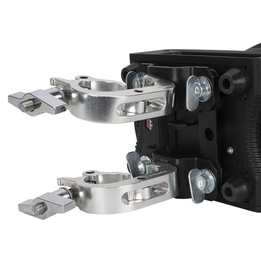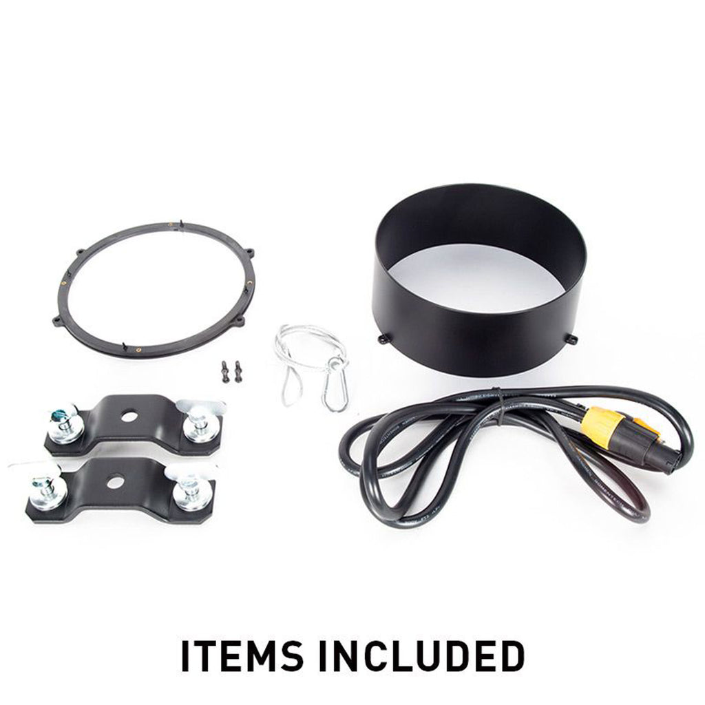 The fixture comes standard with locking power In/Out connections, locking 3-pin & 5-pin DMX In/Out sockets, color LCD menu display with 6 button control panel, multiple unit power linking, a multi-voltage universal auto switching power supply (AC100-240V), USB port to conveniently update firmware, and omega brackets with two hanging points.