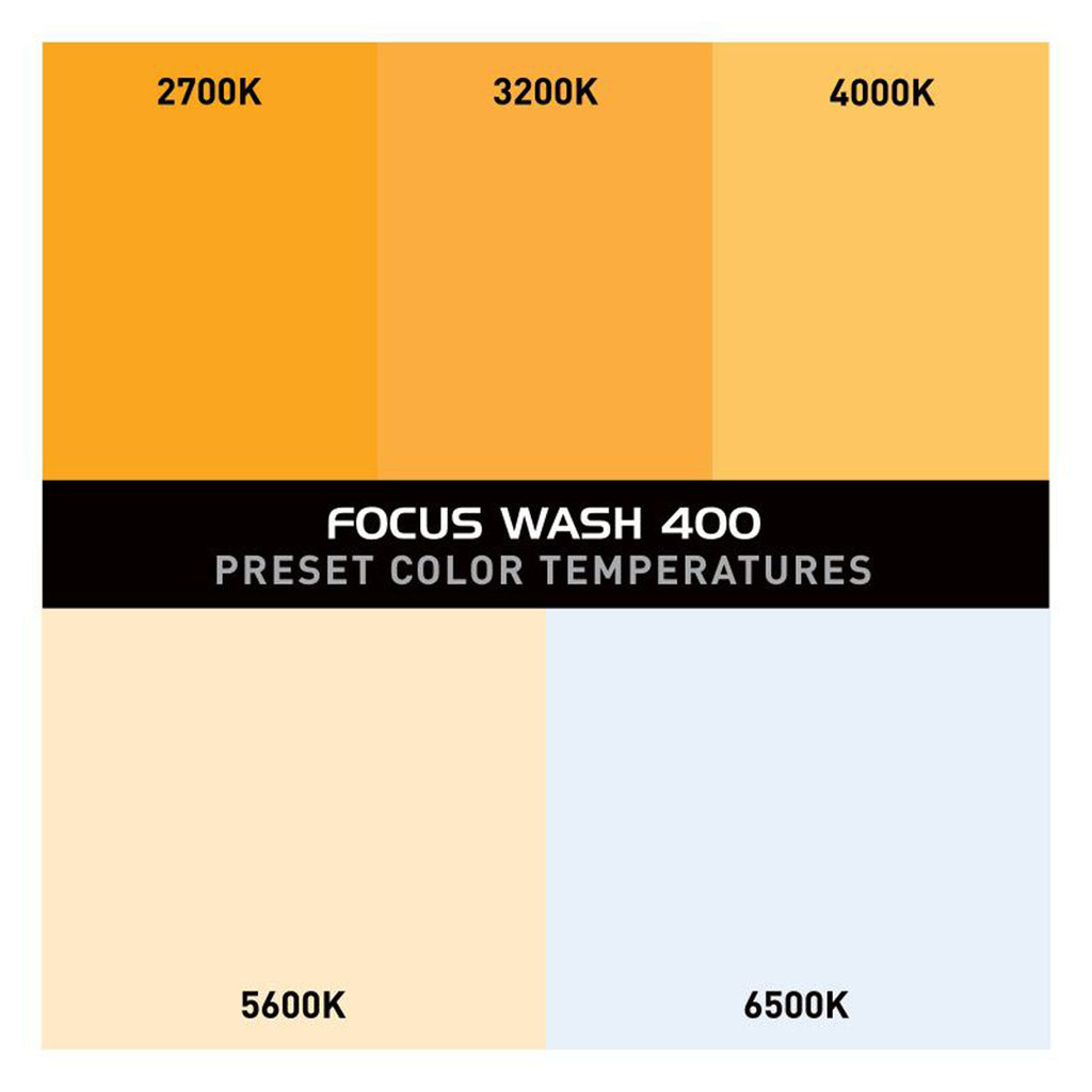 Ideal for live broadcasting and film use, this fixture has flicker free operation, adjustable refresh rates from 900Hz to 25kHz, a quiet fan mode, linear white color temperature control from 2700K - 6500K, as well as, preset white color macros (2700K, 3200K, 4000K, 5600K and 6500K). In addition to it's tunable white feature, the Focus Wash 400 has a virtual CMY color mixing channel which allows users to choose any hue on a color picker.