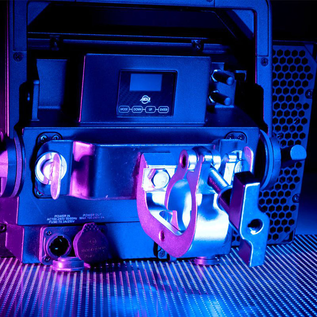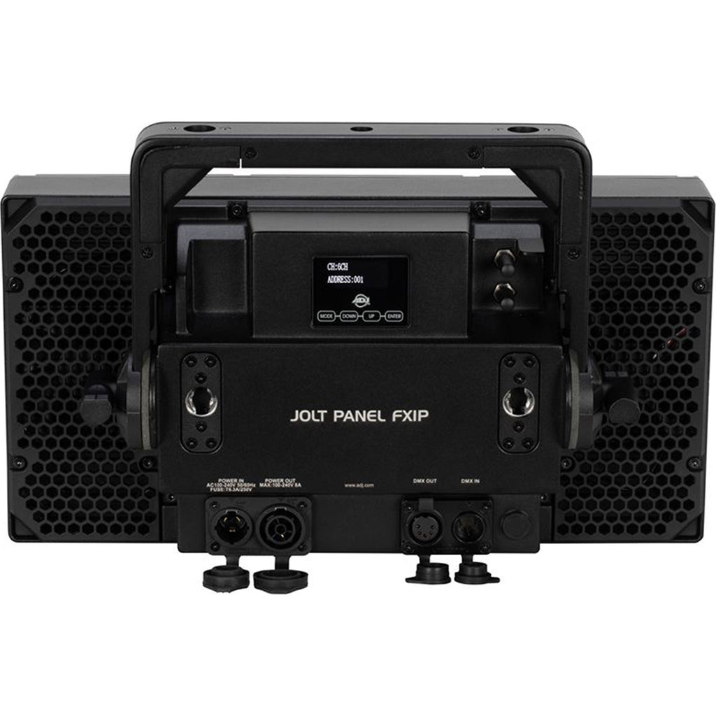 The rear panel has conveniently located IP65-rated 5-pin DMX in/out connections along with IP65-rated locking power in/out sockets to daisy chain power. There are also holes to connect an omega bracket to the Jolt Panel FXIP as an alternative to its variable angle bracket.