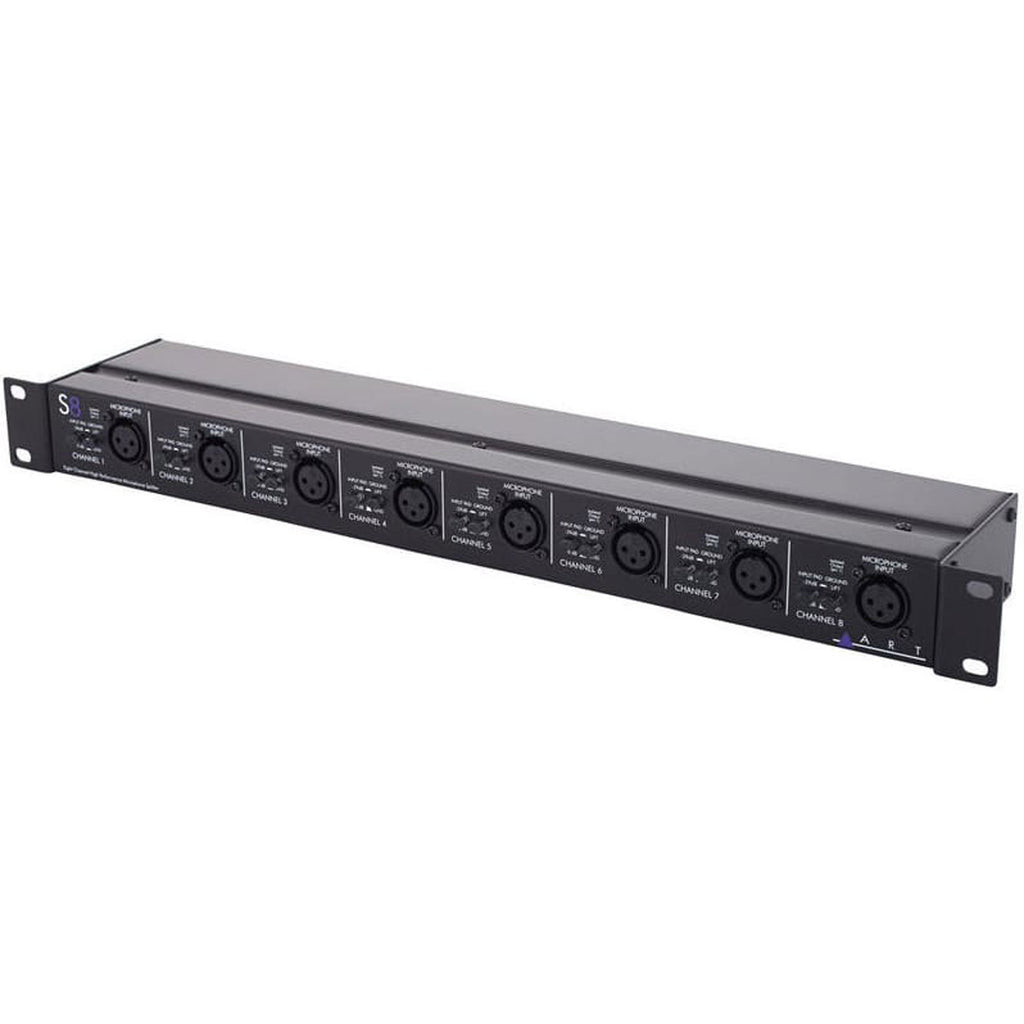 The S8 includes a ground-lift switch on each isolated output to reduce noise due to ground loops between connected equipment. For versatility the S8 also features an attenuator pad switch on each input that can be used to connect preamplified signals to the two microphone-level outputs on each channel. Typical preamplified signals would originate from instrument preamplifiers, mixers, keyboards, et cetera.
