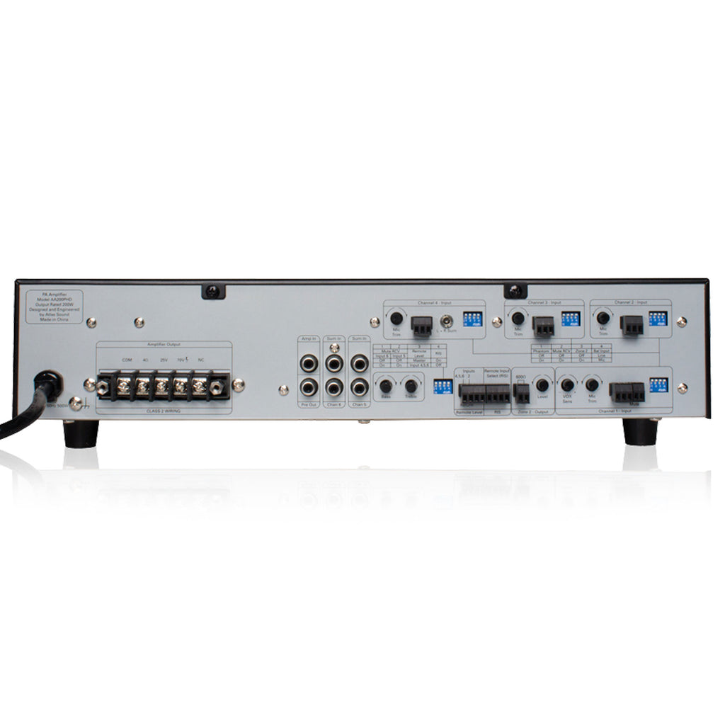 The AA200PHD provides 200-watts output power into 25V, 70.7V, or 4Ω speaker systems. Rear panel DIP switch allows for creation of Zone 2 output mix using any or all of inputs 1-4. Unit can also be set-up to mute Inputs 2 through 6 on signal from Input 1 for paging applications where other input sources need to be muted during a page. Inputs 1-4 are either Mic or Line input selectable and Phantom Power is an option when using them as a microphone input.