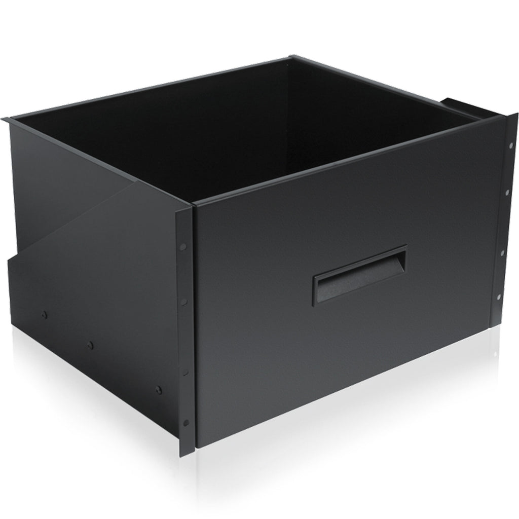Recessed mounting drawer has 6RU panel space, a depth of 14-13/32", and full extension slides for storing tapes, CD's, microphones, tools, and other accessories in 19" cabinets. Unit features ball-bearing slides for smooth opening and closure. It also includes detents to assist when securing drawer in closed position. Sturdy, 16-gauge CRS assemblies will support 100 lbs (45.39kg). Inside width of model is 16-5/16" (414mm).