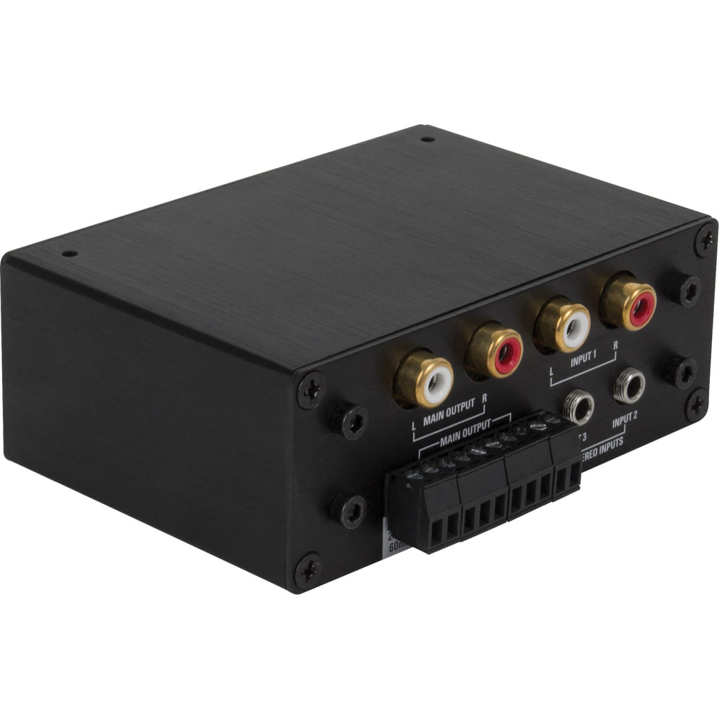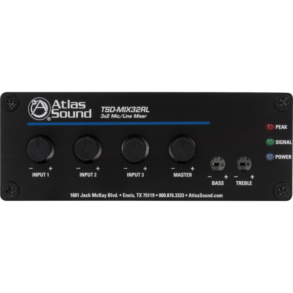 The Atlas Sound TSD-MIX32RL is a 3x2 stereo line mixer with Remote level control. It is ideal for applications where multiple stereo line sources need to be combined into a preamp utilizing the local or remote Master level control. The unit can be easily interfaced with Atlas Sound amplifiers. Applications include restaurants, conference rooms, and schools.