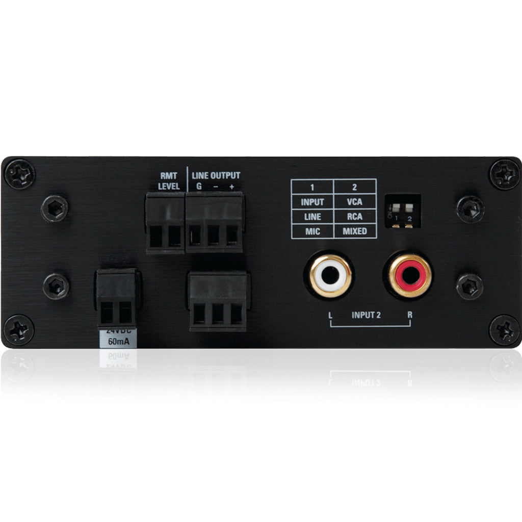 The remote level control feature allows use of the Atlas Sound AAVC-10K (or equivalent) decorative wall plate control for convenient remote adjustment of either the entire mix bus or RCA input 2 only (the typical BGM input).