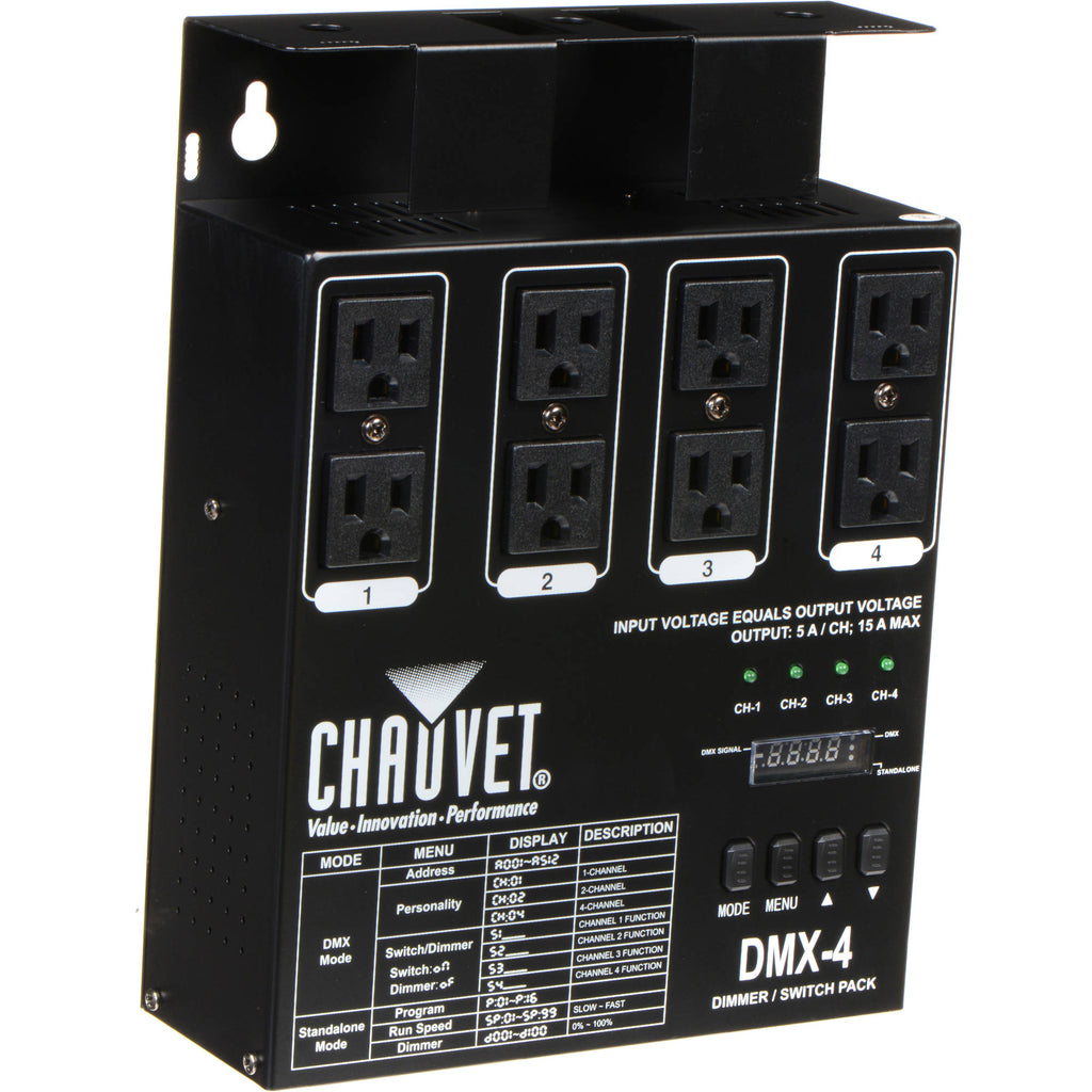 It's a 4-channel dimmer/relay pack providing DMX control for on/off or dimming to units not equipped with DMX on their own. The fixture is optimized for use with small LED fixtures to prevent ghosting and flickering. Each of the 4 sets of outlets (duplex) can be set to any DMX address and independently set as a dimmer or relay. Sixteen user-selectable chase patterns make programming a breeze.