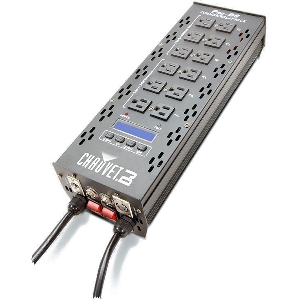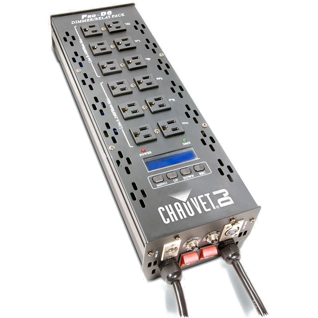 The Pro D6 is a 6-channel DMX-512 dimmer/switch pack designed to work on multiple voltages (115V and 230V) simultaneously, and comes fitted with 20 amp connectors for this purpose. It offers variable electronic dimming and each channel can be set as either dimmer or relay.