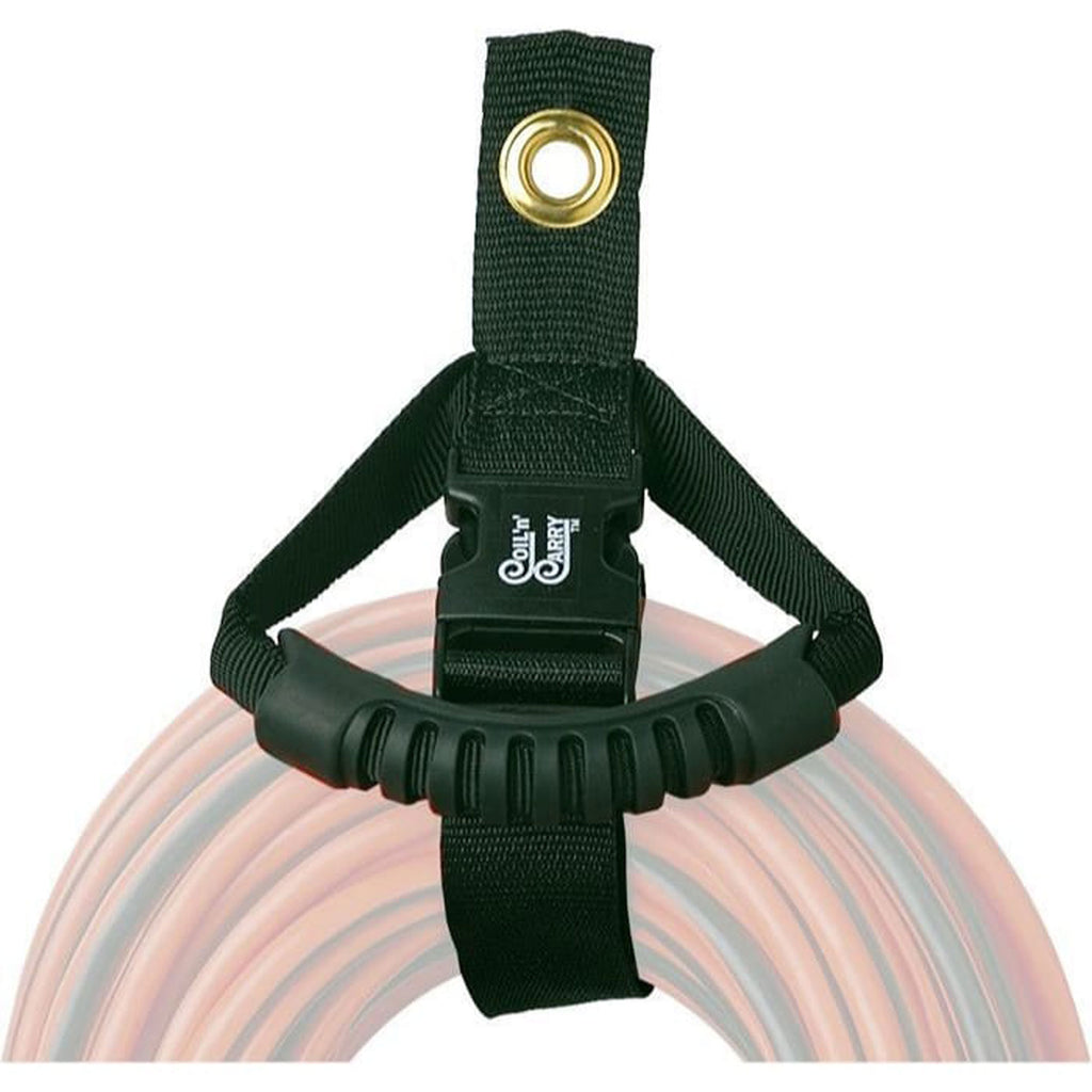The Cord-Lox Coil N' Carry Snake Handle is made from super-strong polypropylene webbing. Comfortable rubberized handle. Hang it from the heavy-duty brass grommet. Handles cables and hoses up to 9" diameter. Nylon side-release buckle keeps the strap firmly together yet it's easy to adjust and unfasten.