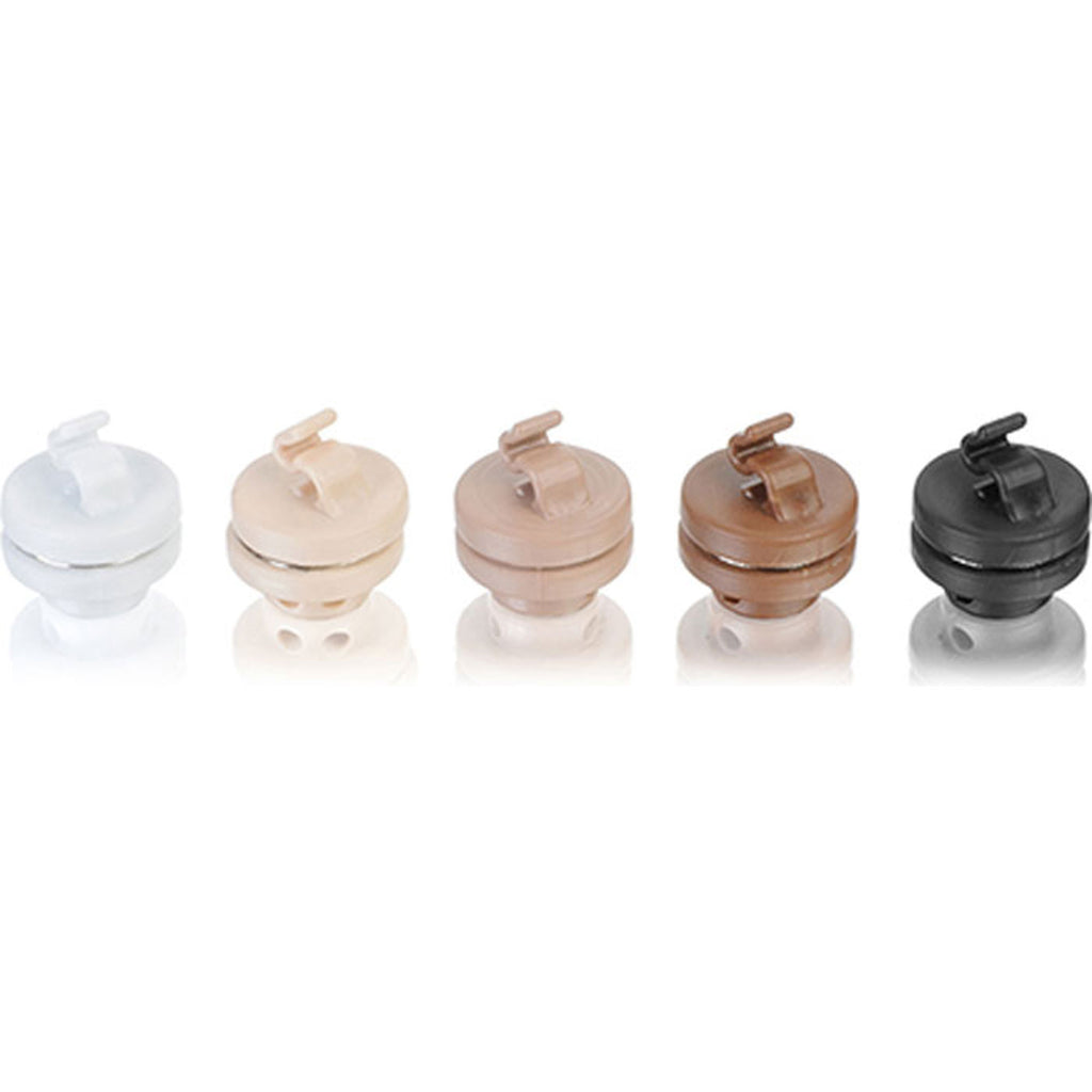 The magnetic clip consists of two halves that can be placed on either side of a piece of cloth and clamp together magnetically. The inner piece has a lanyard made of clear nylon line, which can be hooked over a button to make retrieval easier. This clip is ideal for attaching the mic to delicate materials where pins are inappropriate.