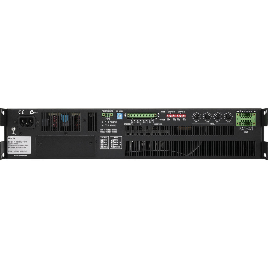 CPS4.10 4-Channel Power Amplifier, 4 x 1000W into 2, or 4 Ohms, or 70V/100V Direct Drive, 2U, ready for RCM-810 IRIS-Net Remote Control Module, In/Outputs Phoenix Type, 120V