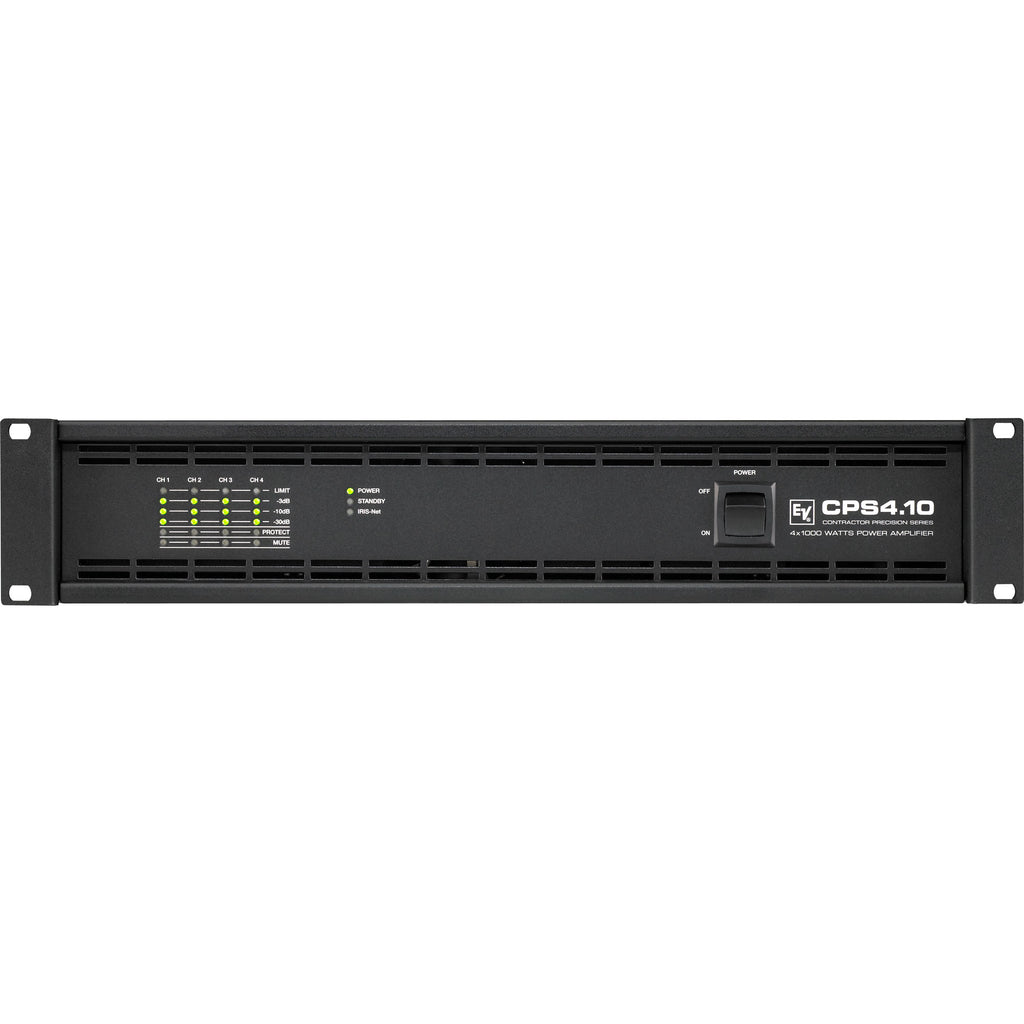 The Electro-Voice CPS4.10 amplifier offers four independent Class-D Variable Load Drive (VLD) amplifier blocks, each one capable of delivering up to 1000 Watts into Low-Z or High-Z loads. Per default, each channel can be configured individually for max. power output into either 2°, 4°, 70V- or 100Vnetworks without involvement of any output transformers. Being designed for professional audio installation market, special care was taken for long term cost of ownership parameters: In addition to remarkably low current consumption and heat dissipation, the CPS4.10 provides remote standby switching with just 5 Watts consumption in standby mode. An optional remote control module RCM-810 provides control and supervision features via IRIS-Net, including monitoring of amplifier status and real time load supervision. In addition, via RCM-810 the Variable Load Drive characteristics can be set for max. power output into any load between 2° and 10°, in steps of 0.1°.