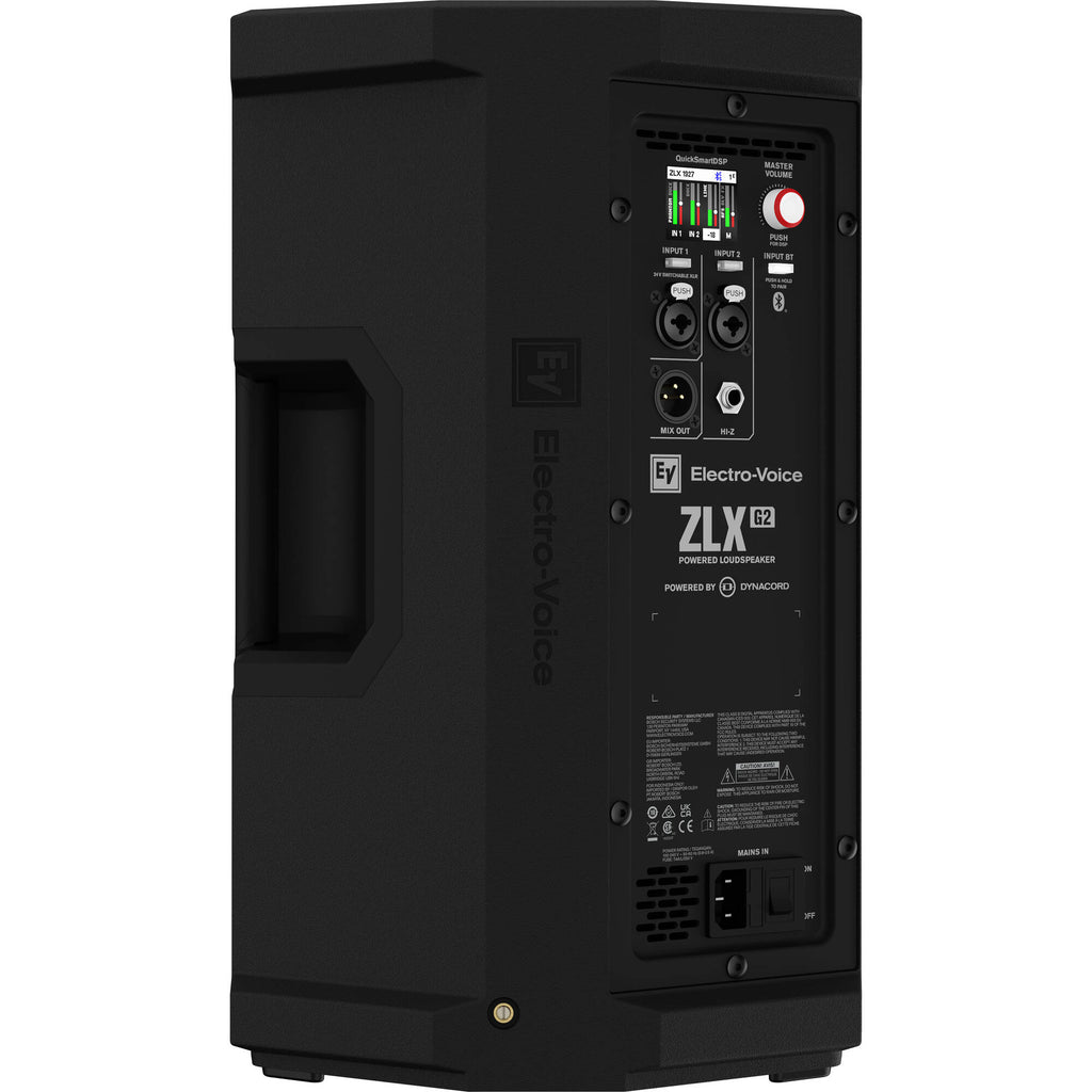 ZLX G2 powered versions are "Powered by Dynacord" - onboard premium electronics from Electro-Voice's sibling brand. Ultra-efficient 1000 W Class-D power amplifier modules feature an integrated four-channel, three-input digital mixer with high-quality effects. The mixer