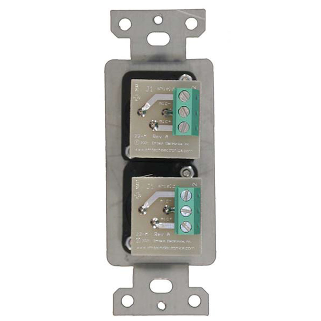 The MSC-G is a microphone input module with two 3-pin male XLR connections on a single-gang decora style metal plate. The module provides a rugged, yet good looking, panel for inputting microphone signals into an existing sound system. It mounts into a standard electrical box (not provided), and is finished off with a matching decora coverplate (see HPS series).