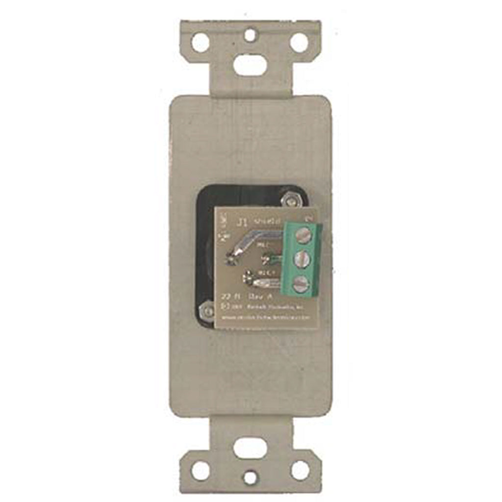 The MSC-H is a microphone input module with a single 3-pin male XLR connection on a single-gang decora style metal plate. The module provides a rugged, yet good looking, panel for inputting microphone signals into an existing sound system. It mounts into a standard electrical box (not provided), and is finished off with a matching decora coverplate (see HPS series).