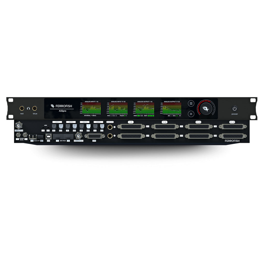 The A32pro provides a sophisticated internal matrix for the free routing and splitting of all 128 Ins to all 128 Outs in blocks of 8 channels. The headphone output allows it to monitor every mono,stereo or even in M/S (mid/side) I/O channel from the front of the unit.
