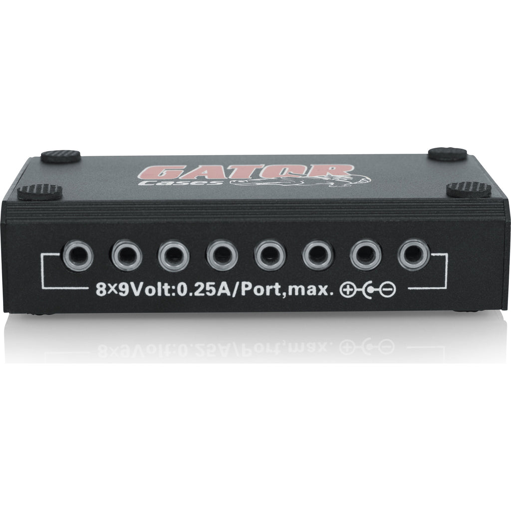 The G-BUS-8-US has heavy-duty aluminum housing and 4 mounting holes for mounting to Gator Pedal Totes, Gig Box Series or any other pedal board. The power supply features eight (8) 9v outputs, three (3) 18v outputs and a short circuit protection with quick reset. Also included with the G-BUS-8-US is a 1700 milliamp switchable power supply and nine (9) 24" cables for each output to power pedals. The G-BUS-8-US can be purchased individually or coupled with our Powered Pedal Tote Series.