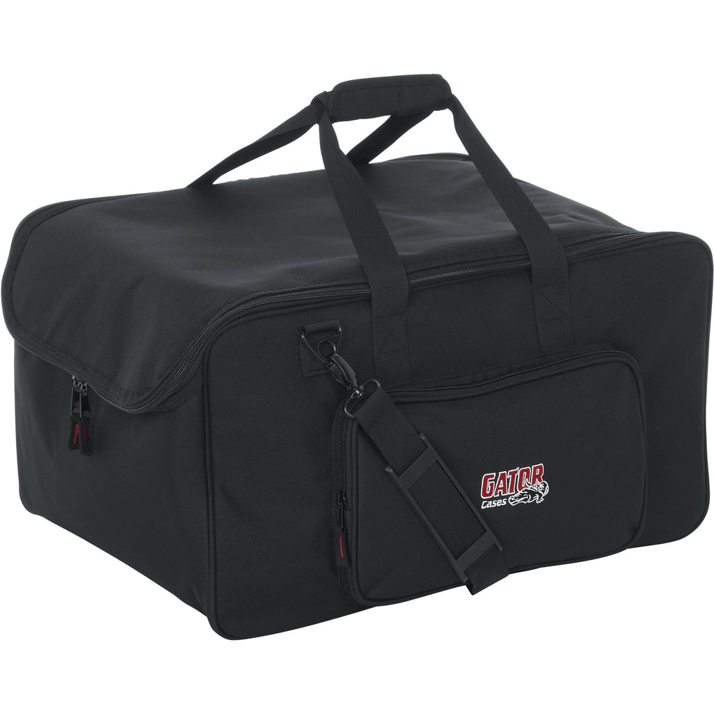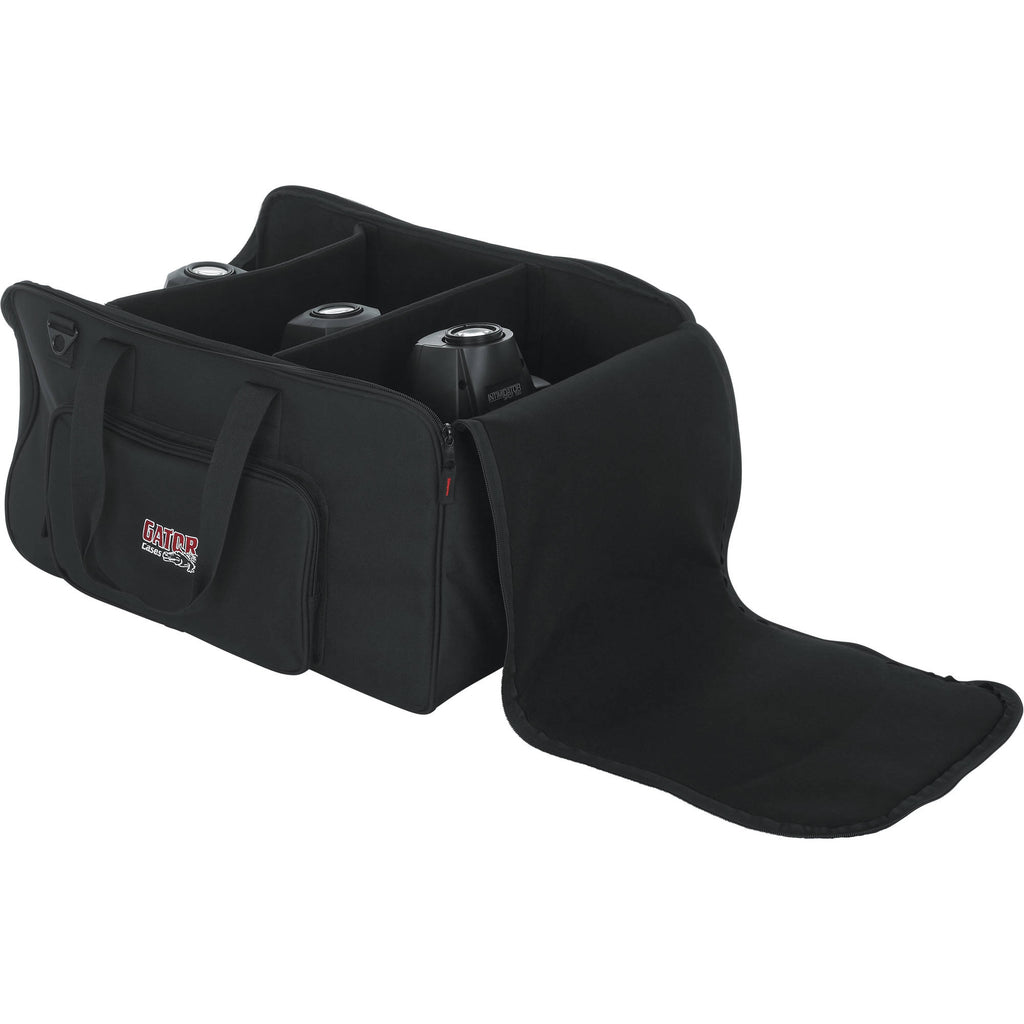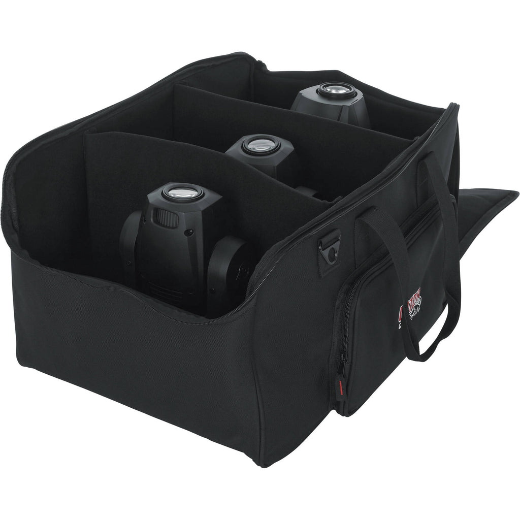 Store, transport, and protect up to four LED PAR-style lights in the black 2212 LED PAR Lighting Tote Bag from Gator Cases. This tote-style bag features water-resistant, padded polyester construction, and a dual-zipper closure for easy access to your gear. Padded touch-fastening interior dividers help protect your PAR lights from damage. The front exterior of the bag has a zippered pocket for cables and assorted accessories. Wear it with the included shoulder strap. Carry the bag with the dual connecting top strap handles.