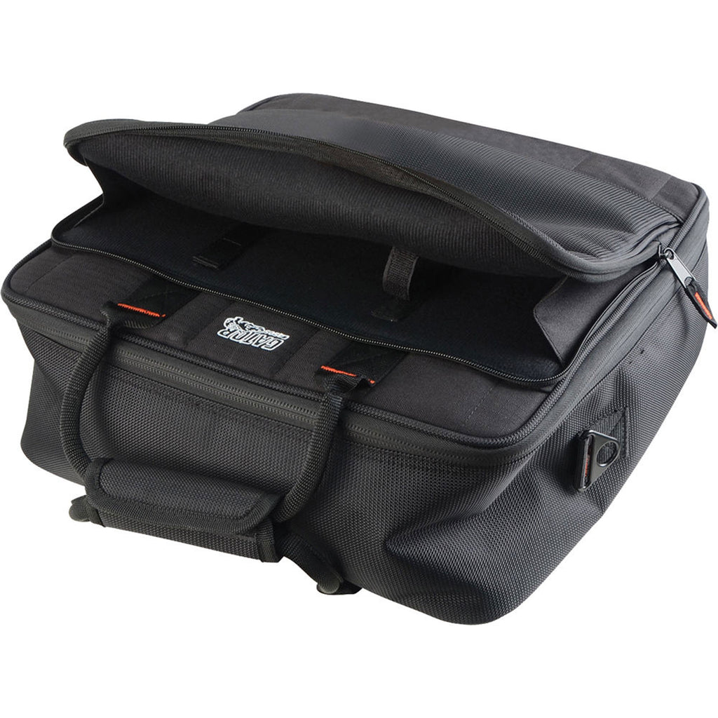 The G-MIXERBAG-1515 Padded Nylon Mixer/Equipment Bag from Gator Cases is a bag for carrying and storing a mixer or equipment. It has external storage pockets with cord management, a removable shoulder strap, and comfortable webbed handles.