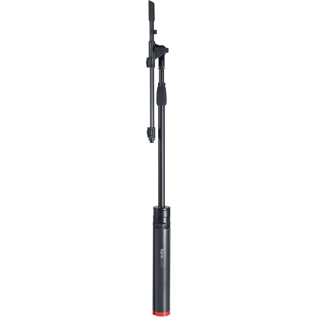 The Frameworks ID Series Tripod Mic Stand with Telescoping Boom from Gator Cases features a secure, patent pending design with one-handed CAM operation. Its tripod base neatly folds into a cylindrical shape for low-profile portability. The 26" telescoping boom adjusts with easy close CAMs. It also includes a cable management clip.