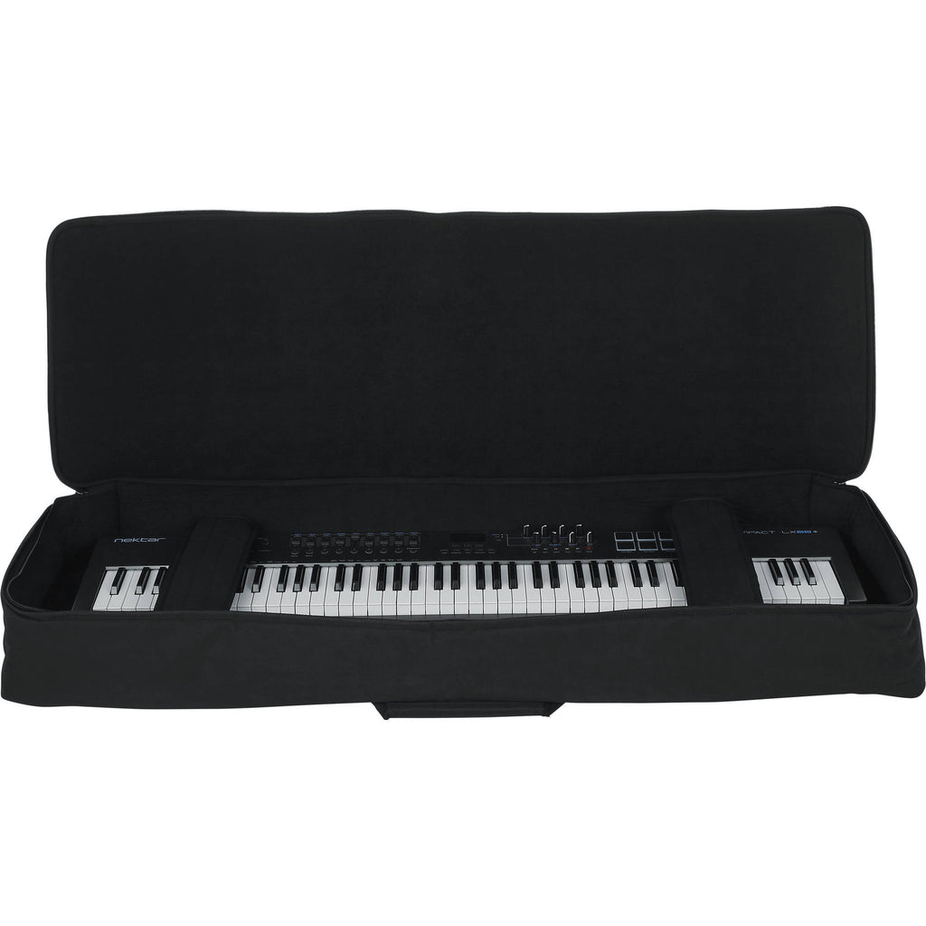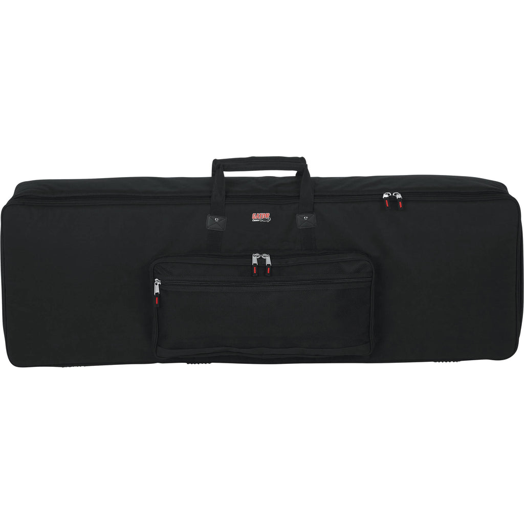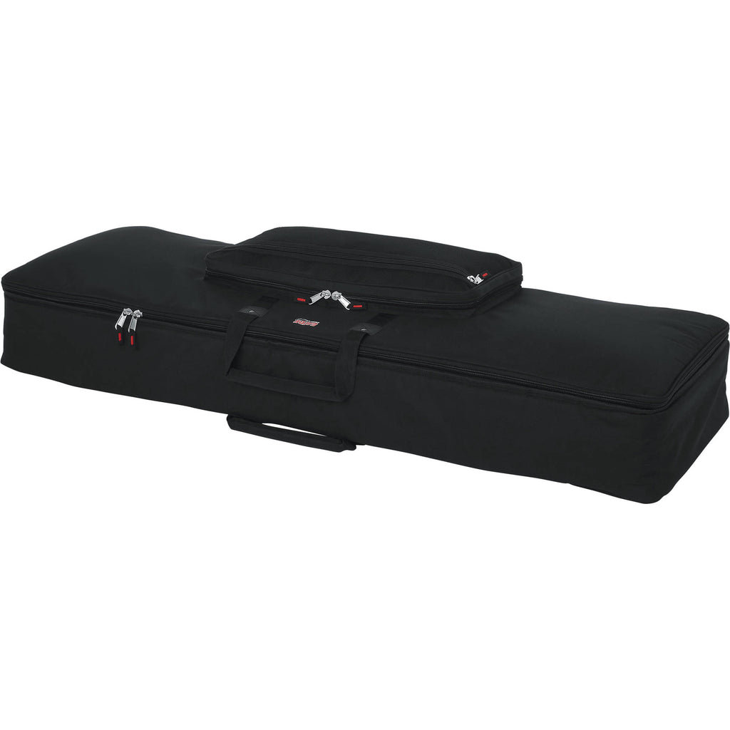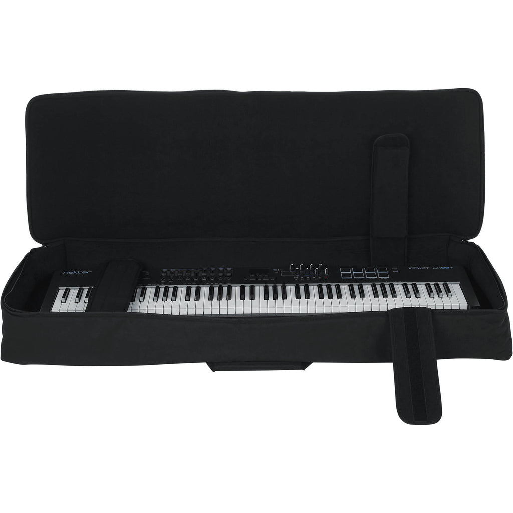 The Gator GKB-88 Keyboard Gig Bag is a 20mm padded 600 denier ballistic nylon keyboard case that fits standard profile 88-key keyboards, stage pianos and synthesizers. The case features Black chrome hardware, large zippers, padded secure straps and reinforced comfort carry handles for easy transport.