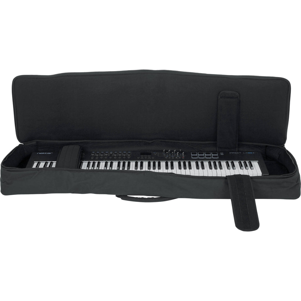 The Gig Bag For Slim, Extra Long 88 Note Keyboard from Gator Cases is constructed from heavy duty rugged nylon to protect your keyboard while not in use. Inside, adjustable padded secure straps keep your keyboard in place and prevent the keyboard from shifting during transport. The exterior features an accessory pocket as well as 2 comfort grip handles for easy carrying.