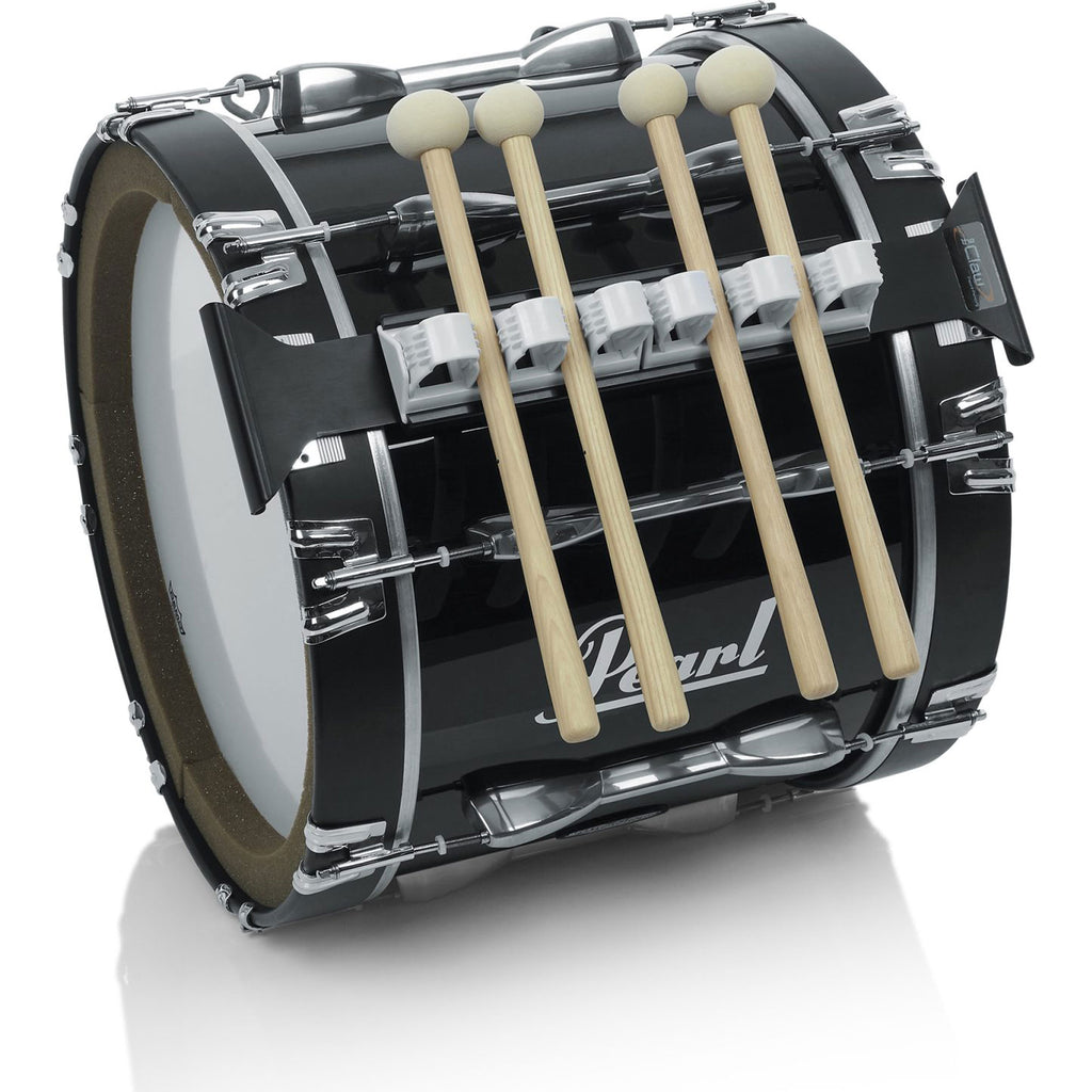 • Revolutionary spring-loaded, quick-release system provides quick bass drum mallet placement for 14" and 16" deep marching bass drums
