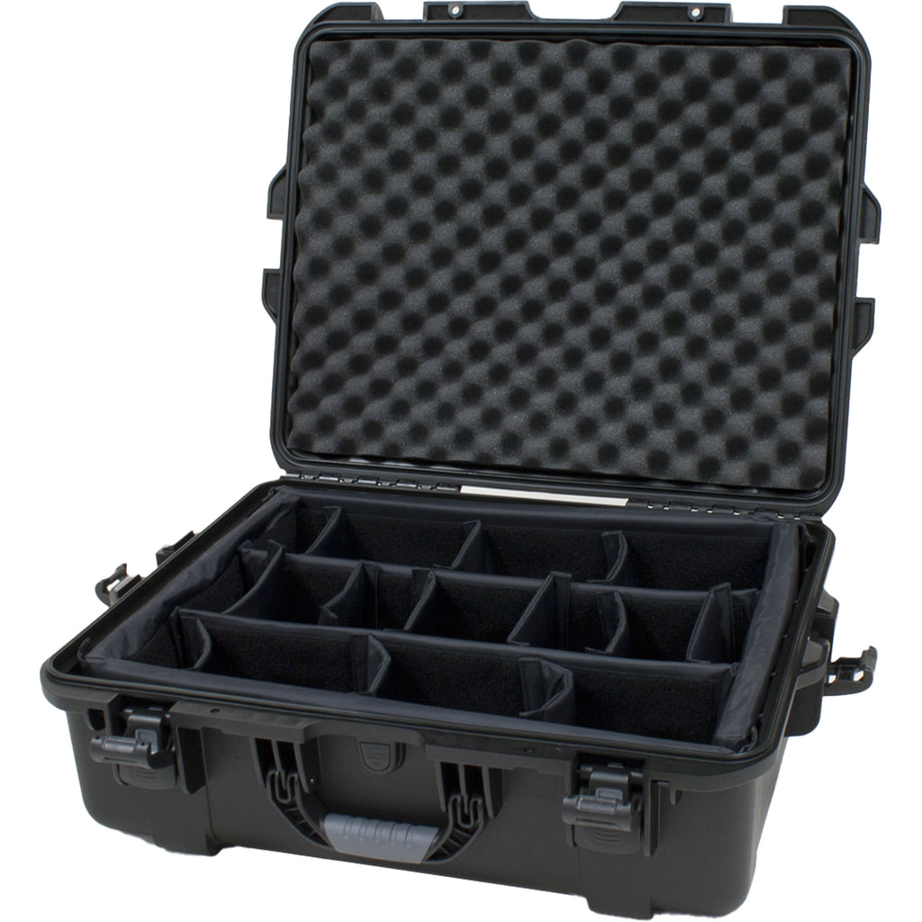 Black waterproof injection molded case with interior dimensions of 22" x 17" x 8.2". INTERNAL DIVIDER SYSTEM