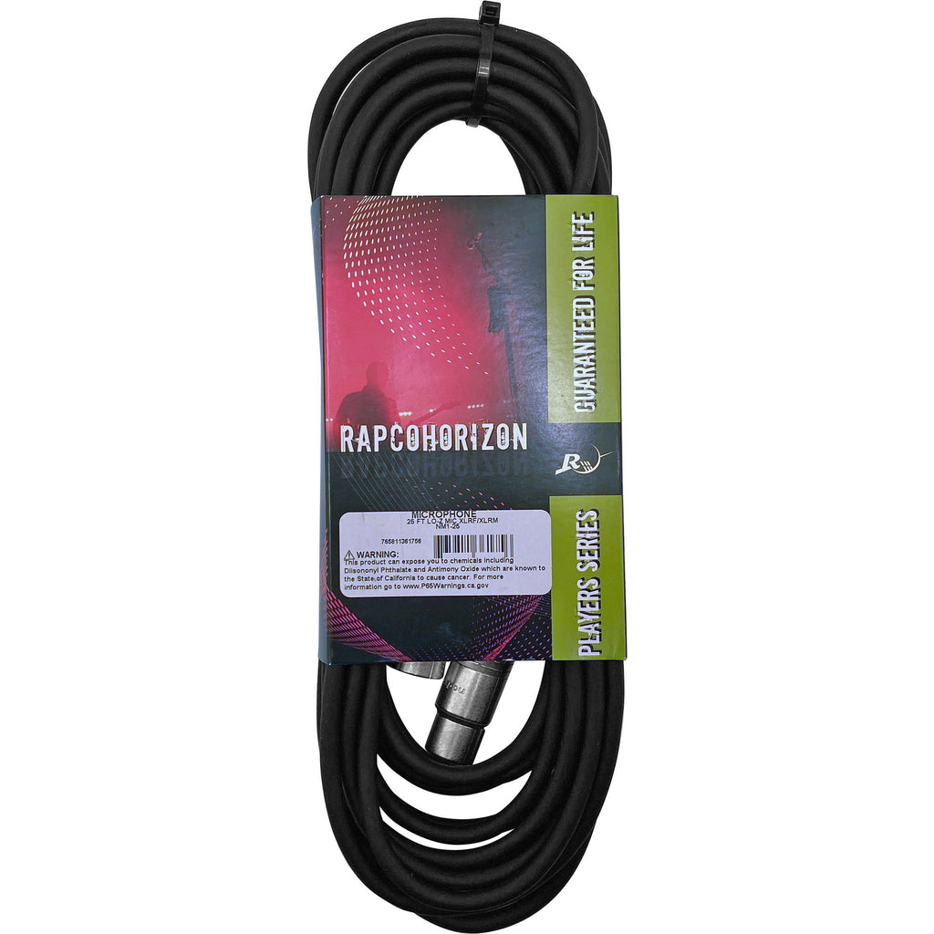The RapcoHorizon 25 Foot XLR Male to XLR Female balanced microphone cable is made from a dual conductor 24 gauge copper cable utilizing a spiral copper shielding. In addition it features professional Neutrik NC3FXX and NC3MXX style XLR 3-pin connectors with the use of silver contact pins. This 25ft length is commonly recommended with any pro audio applications that will need a patch from one particular component to another one. This balanced XLR mic cable will give you a tough and reliable connection all the while sustaining the purity of the audio signal.