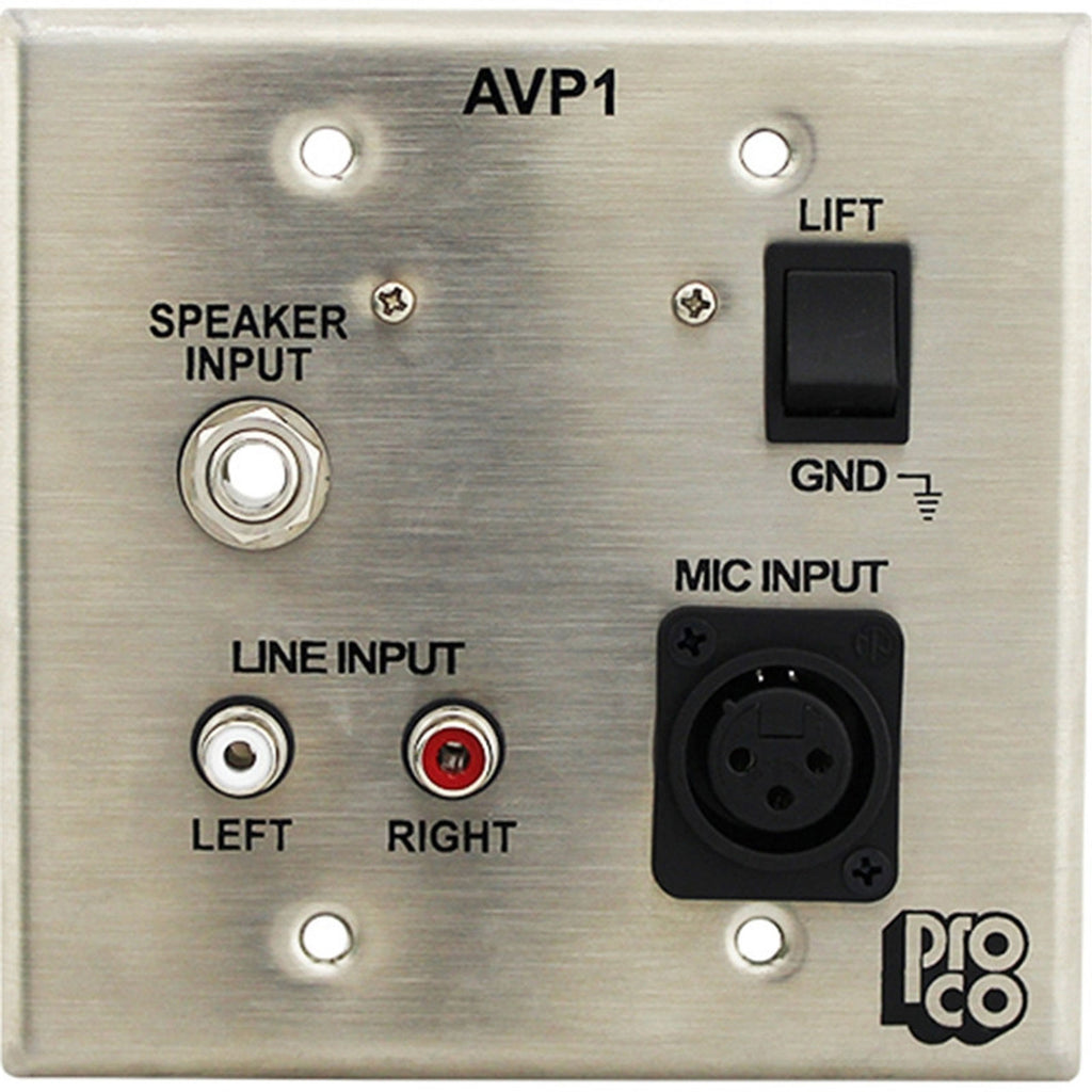 The Proco AVP-1 is a wall-mounted impedance matching unit with multiple audio inputs, designed for Audio/Video applications in school classrooms, lecture halls, and metting or conference rooms. The unit features a dedicated microphone input, a transformer-balanced, low-impedance barrier strip output, and a hum-canceling ground loop switch on the front panel.