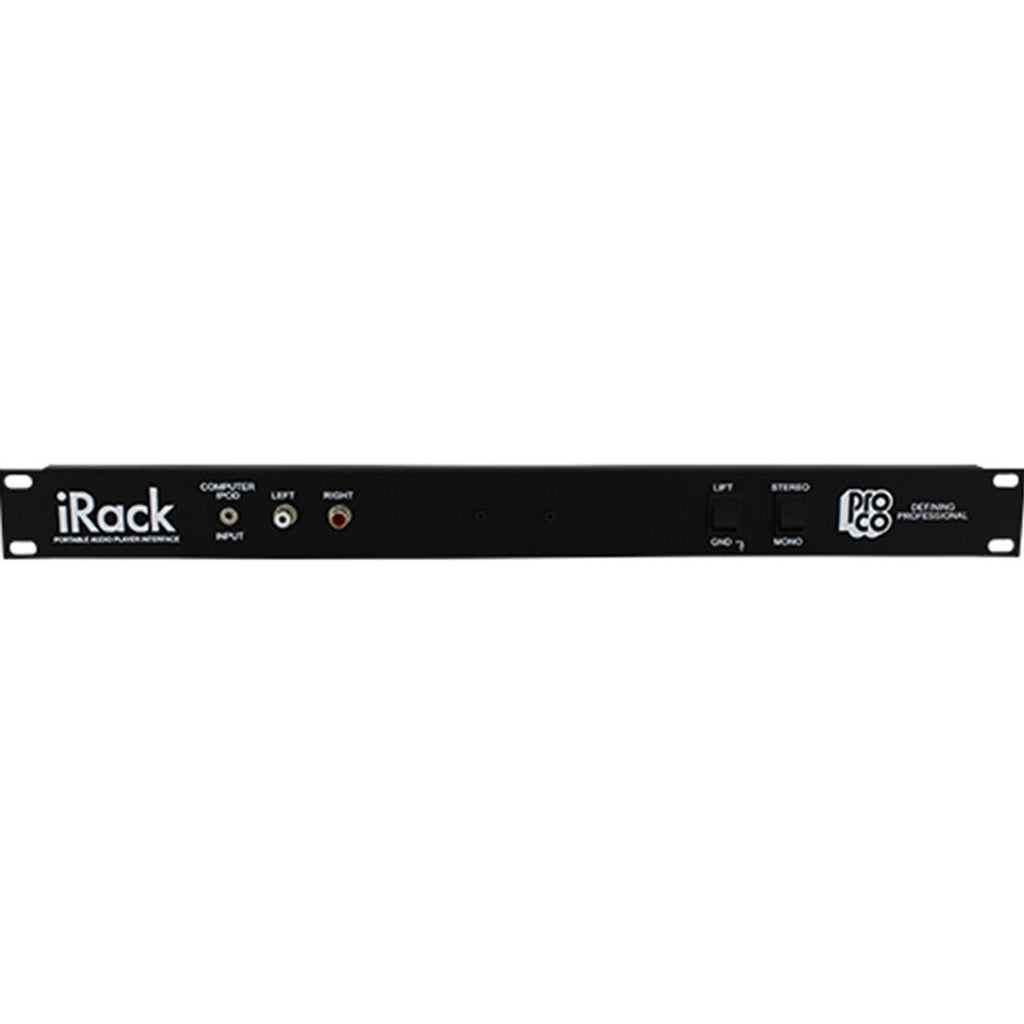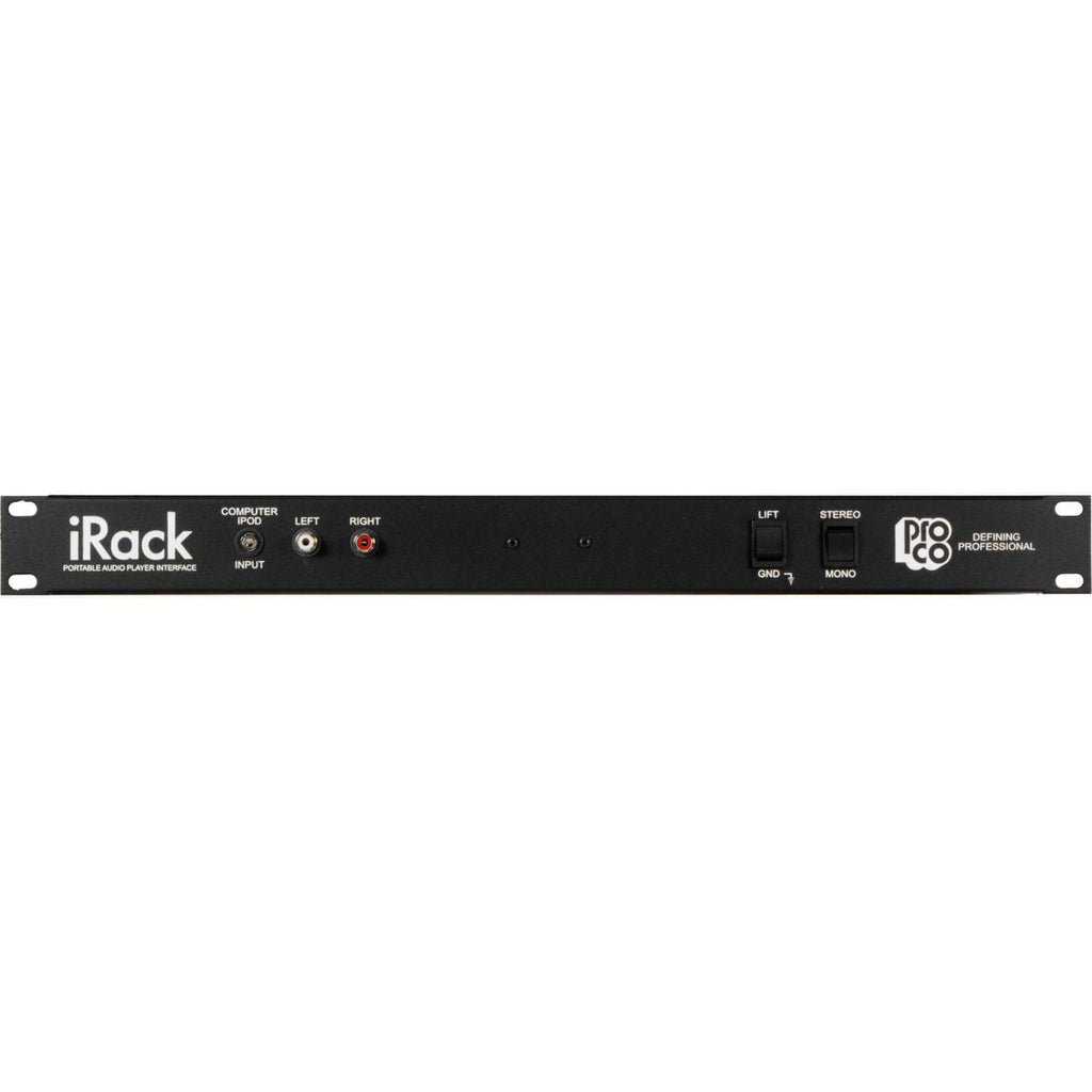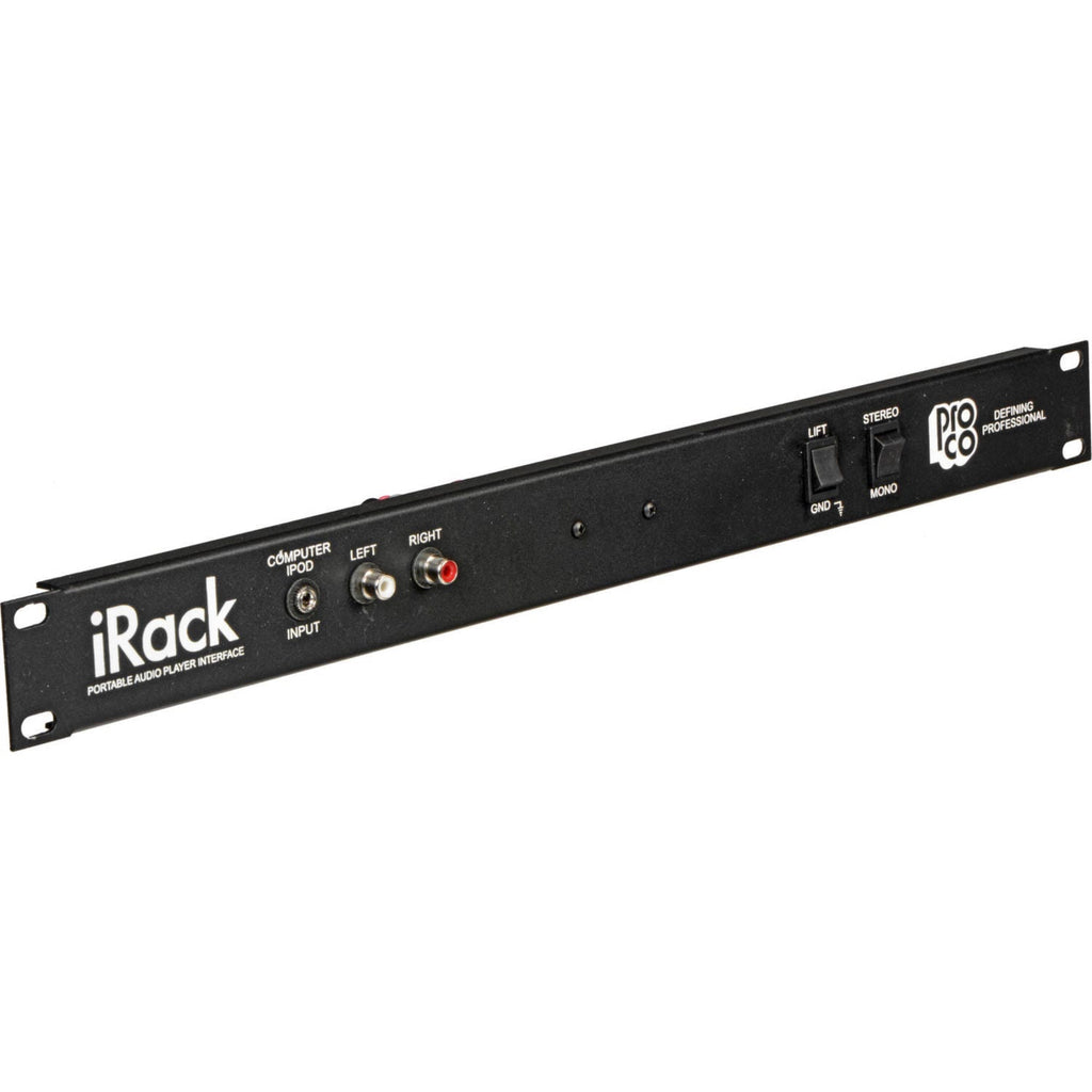 The ProCo iRack Portable Audio Player Interface is a device that allows simple and reliable connection of the stereo headphone output of audio devices such as MP3 players, Apple iPods, laptop computers and consumer-type CD and DVD players to the balanced microphone inputs of audio mixing consoles.