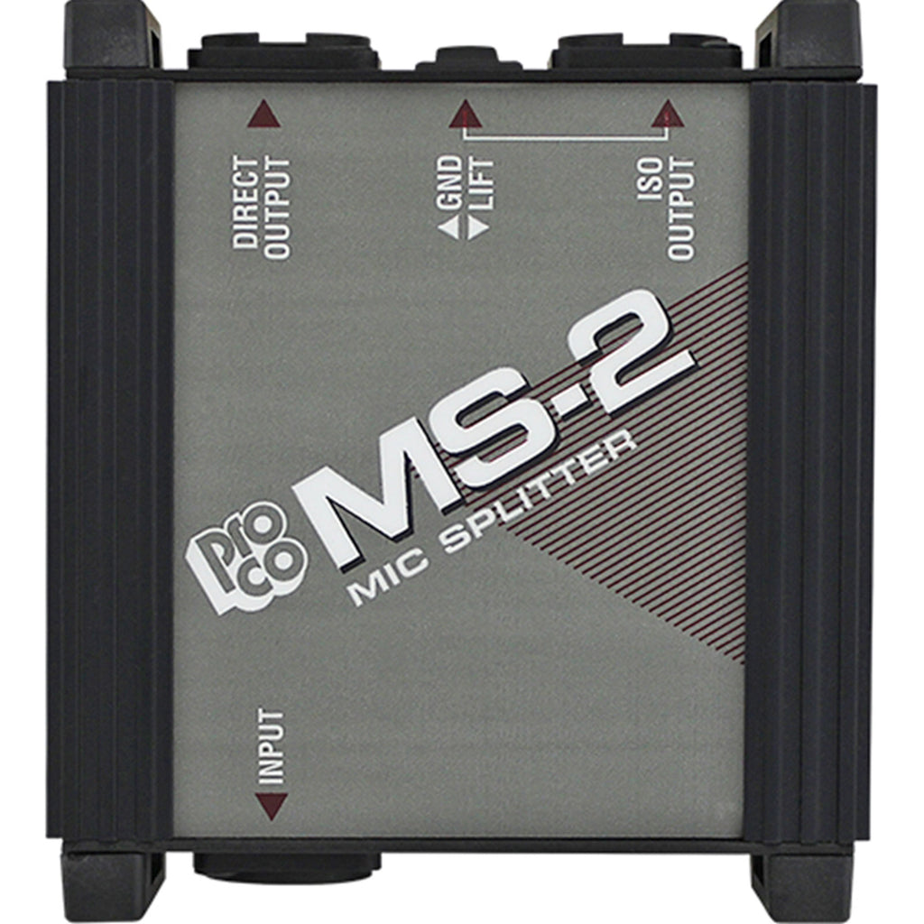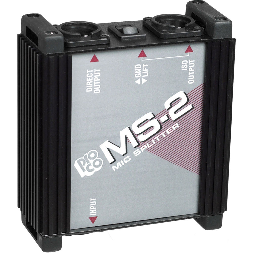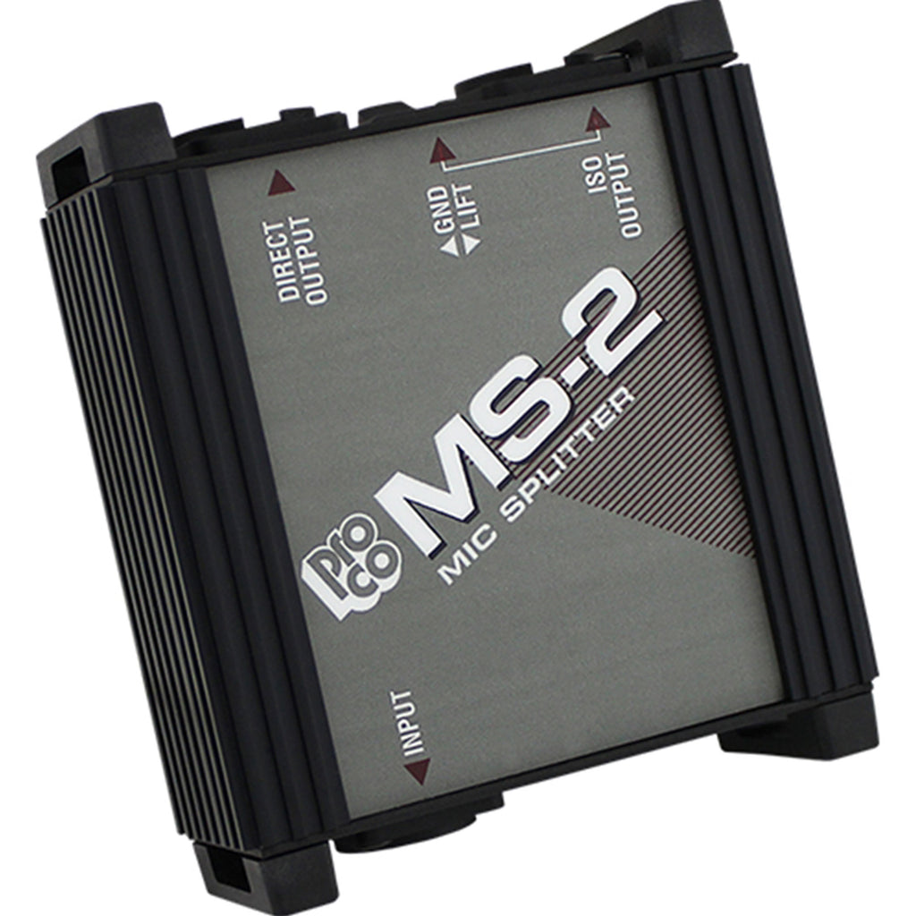 The ProCo TradeTools MS2 Mic Splitter splits a signal from a low impedance microphone (or similar source) into two outputs, enabling two microphone preamplifiers to be fed from one source. Some applications include musicians' on-stage monitoring, live recording, ENG use at press conferences,and videotaping of lectures, public speeches, etc. It can also be used simply as an isolation transformer for long microphone lines feeding unbalanced inputs, or for any audio signal up to 0 dBv (.775 volt). Transformer isolation in such situations minimizes interference from EMI/RFI and ground loops. The transformer-isolated feed retains the advantage of common-mode noise rejection inherent in the use of balanced lines.