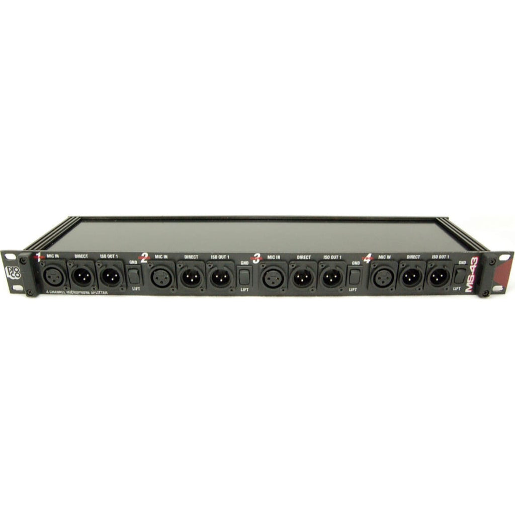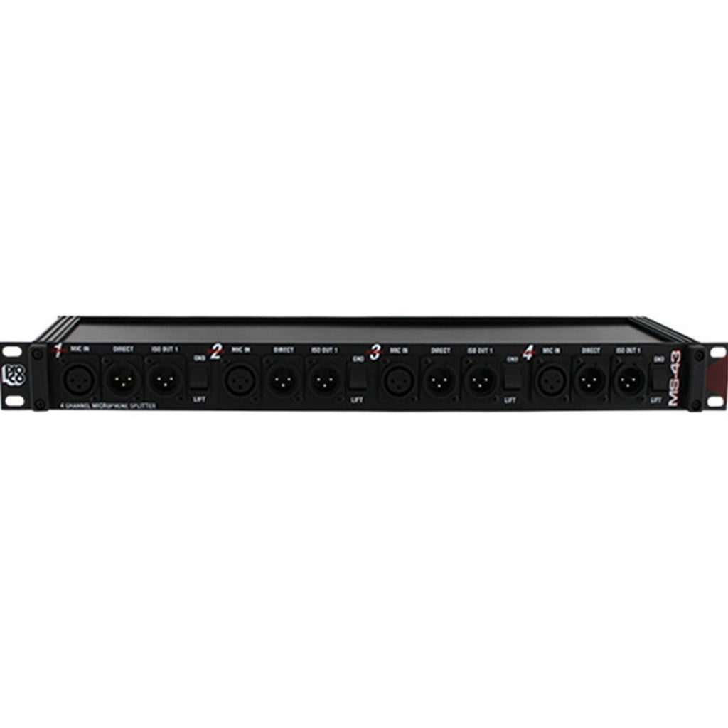 The ProCo TradeTools MS43A Quad Mic Splitter splits the signals from each of four low-impedance microphones (or similar sources) into three outputs, enabling three microphone preamplifiers to be fed from one source. The primary application for the MS43A is in large sound reinforcement systems, where the P.A. system microphones must also be fed to a stage monitor system and a broadcast or remote recording mixer. In such complex systems grounding problems can cause both unacceptable noise levels and severe shock hazards. Transformer isolation in such situations minimizes interference from EMI/RFI and ground loops. The transformer-isolated feeds retain the advantage of common-mode noise rejection inherent in the use of balanced lines.