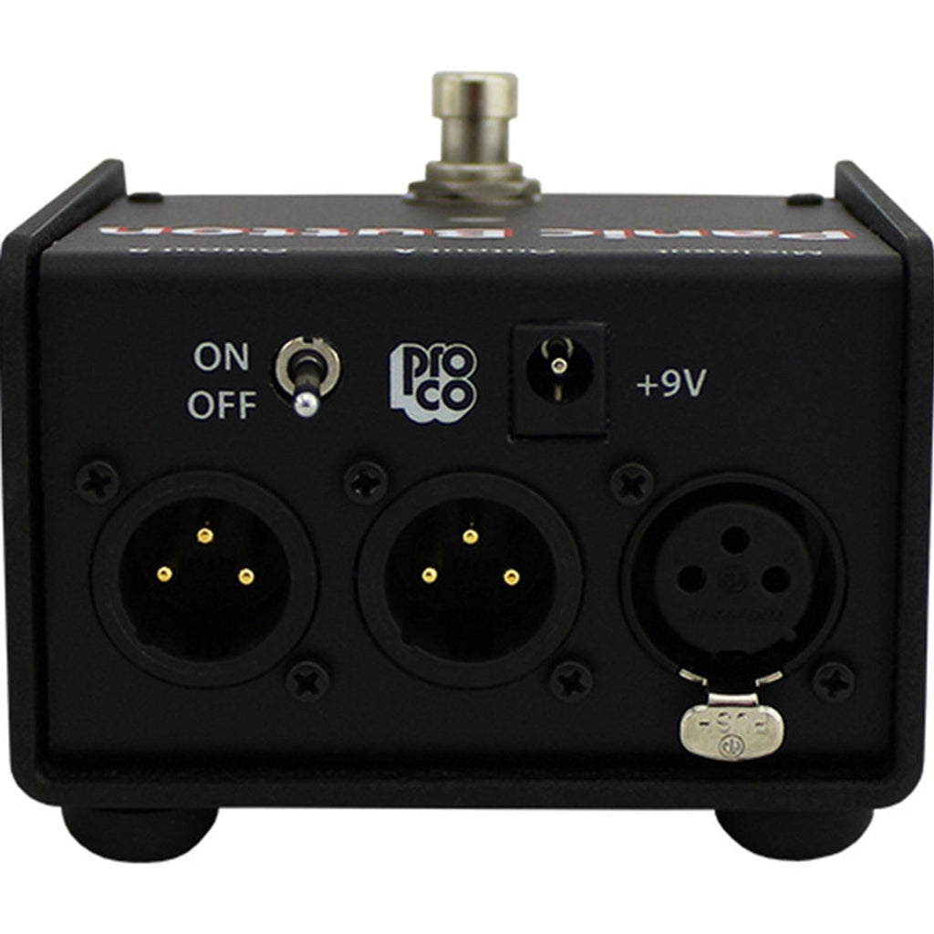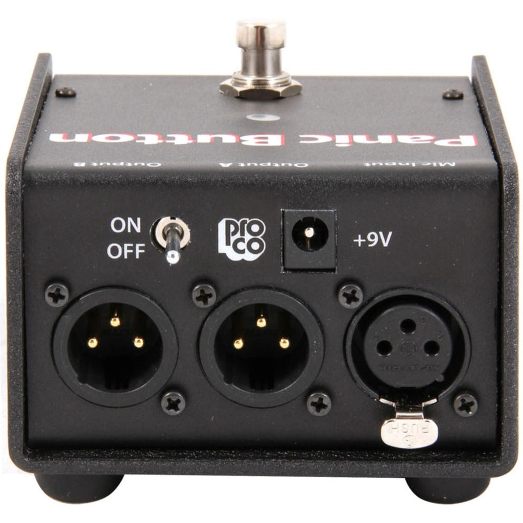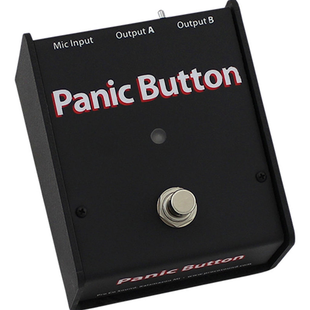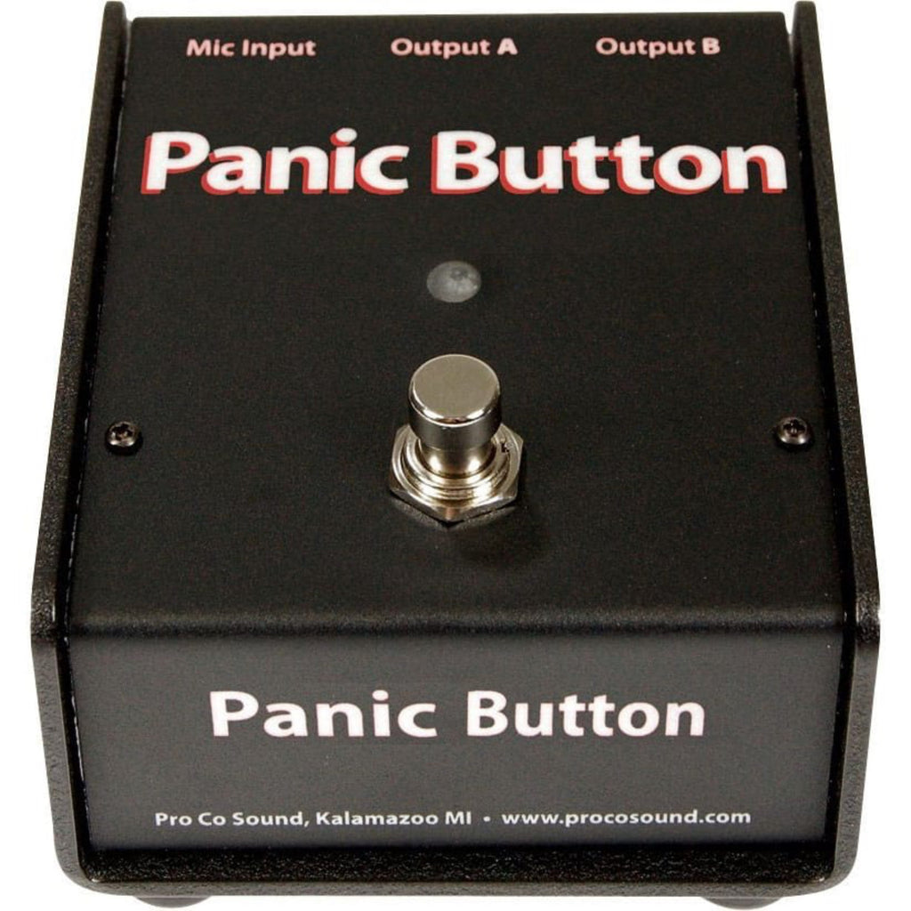 The ProCo Panic Button Microphone A/B and Muting Switch is an active microphone signal routing device that offers clean reliable performance with any balanced or floating low-impedance (150 ohm nominal) microphone or signal source. The foot-operated pedal allows a singer or speaker to reroute the microphone signal from Output A to Output B. The Panic Button may also be set to operate as a momentary push-to-talk, momentary push-to-mute, or latching microphone muting switch. The Panic Button is ideally suited for praise ministers, speakers and professional instrumentalists who need to communicate with their roadies (especially singing drummers and guitarists).