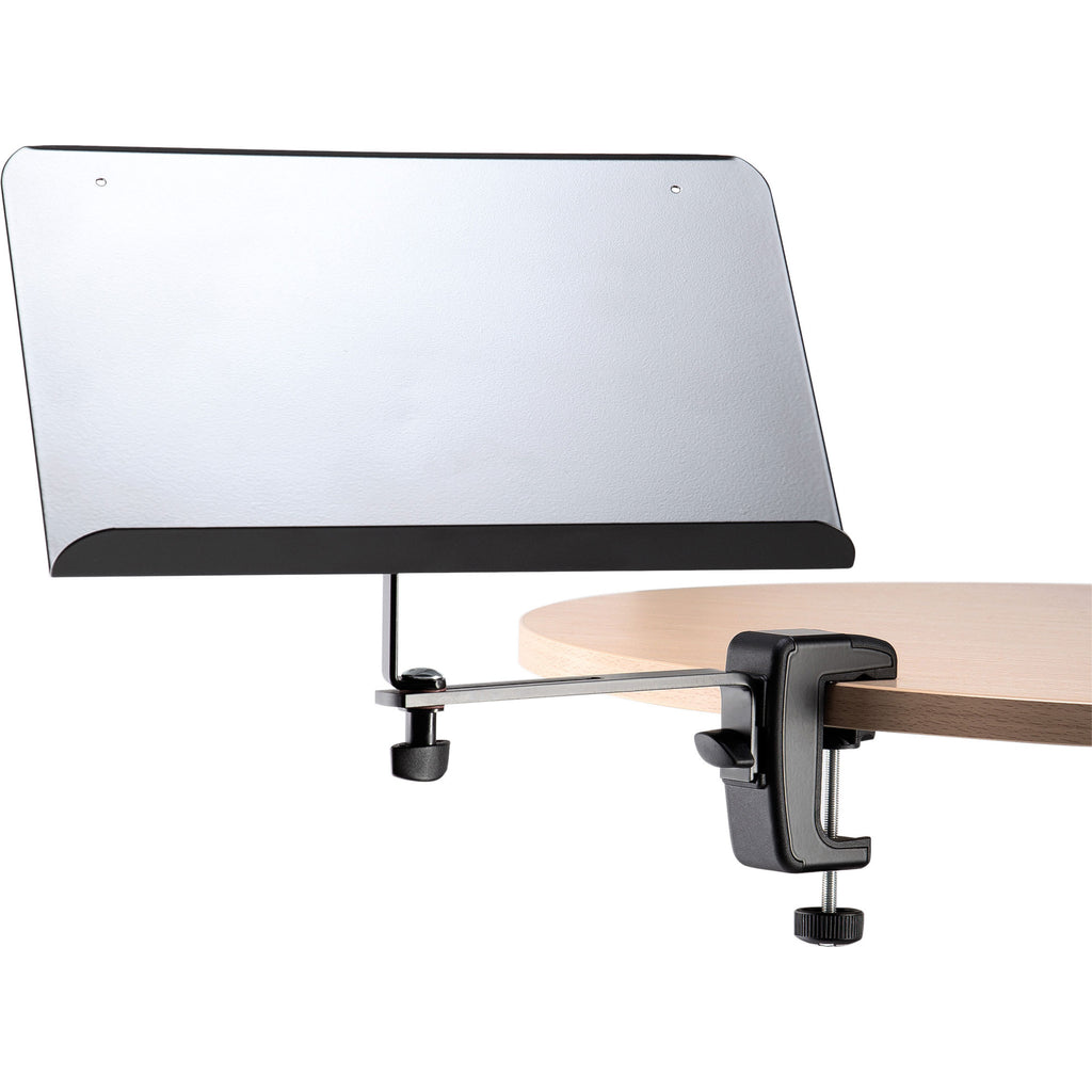 The position (angle) and depth to the stand tube of the tilting 11.8 x 7.9" sheet music holder is adjustable. The music desk has a depth of 1.2". The flexible clamp makes it easy to mount the holder in a wide variety of directions. The clamp can be attached to tables (0 to 1.9" thickness). The sturdy metal frame of the clamp is equipped with high-quality plastic inserts and the non-slip coating ensures that the clamp provides a secure and powerful hold. Thanks to the specially formed clamping surface, the clamp can be used on flat surfaces such as tables or shelfing, as well as on round tubing. The holder is collapsible for easy transport.