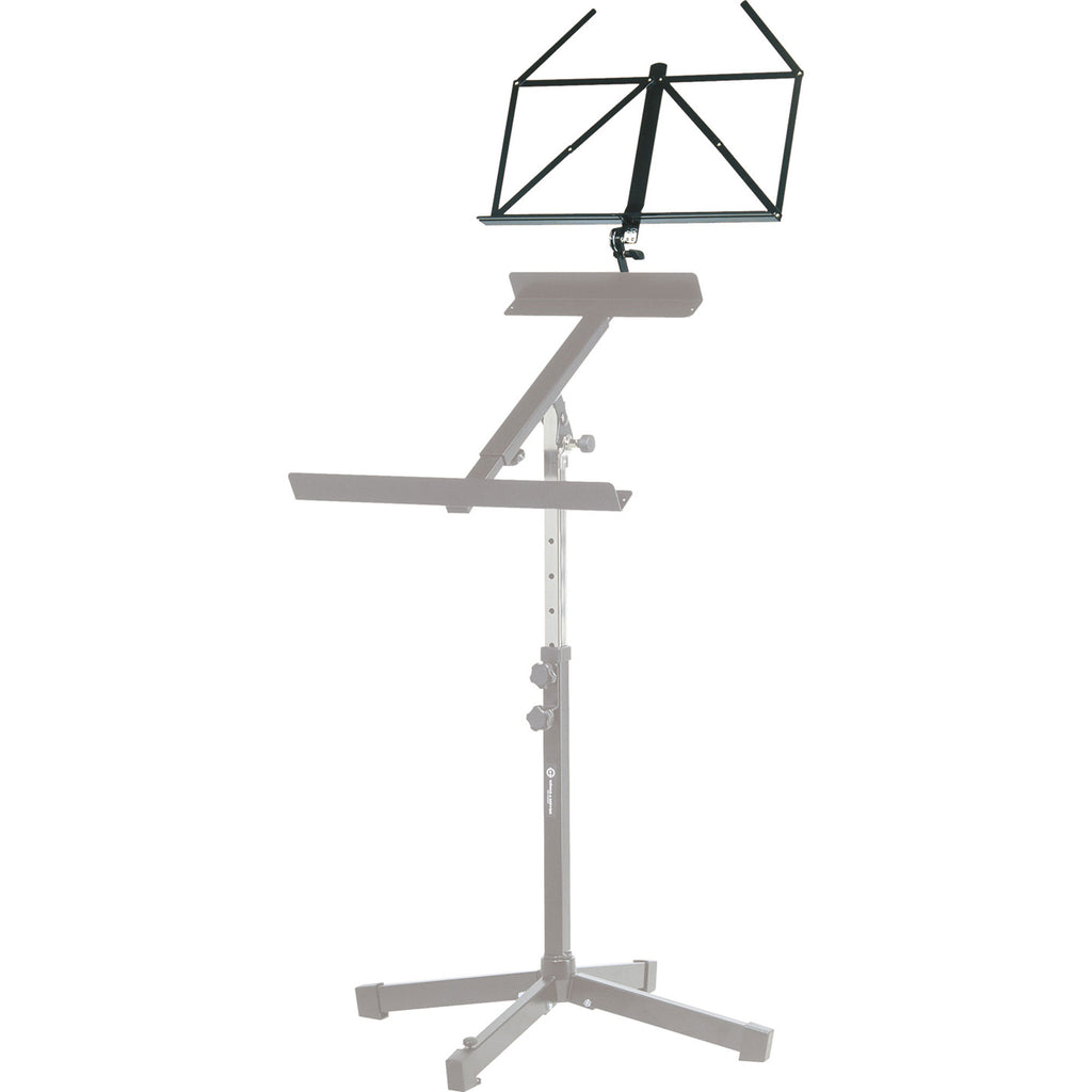 Wide-angle music desk attaches to Hackbrett stand 28070. Foldable for transport.