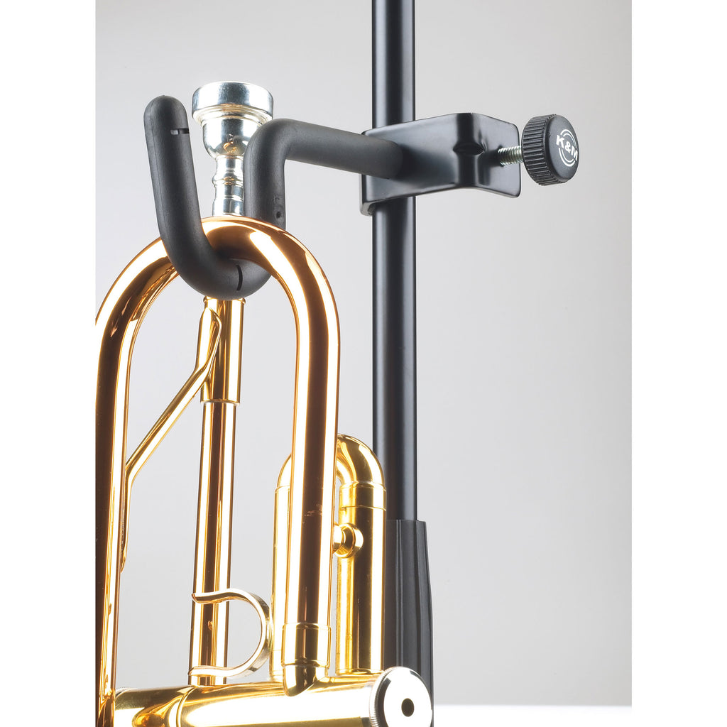 Attaches to music stands. Clamp adjustable to 0.91". Support arm covered with non-marring material to protect the instrument.