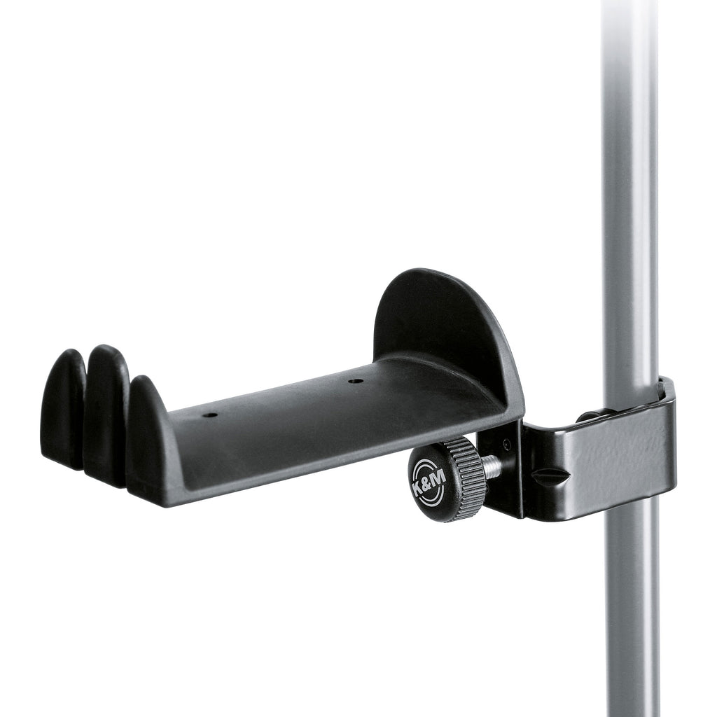 A holder for headphones when not in use. The new headphone holder is simply clamped to the tubes of a music stand or microphone stand, etc. and is generally suitable for a tube diameter max. 30 mm. The soft rubber support can easily take two sets of headphones. In addition, 2 in-ear headphones can also be hung on the slotted front of the holder. The headphones are close to hand and out of harms way.