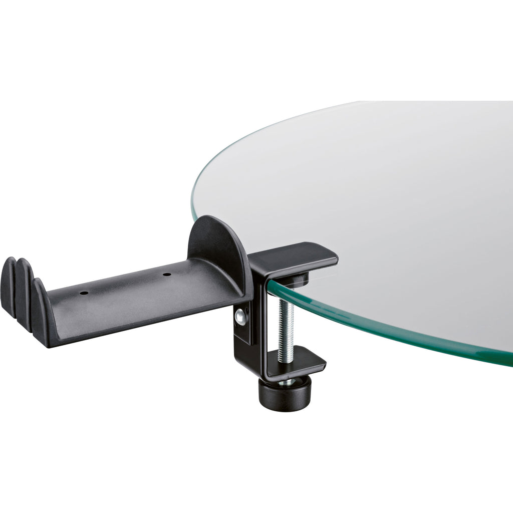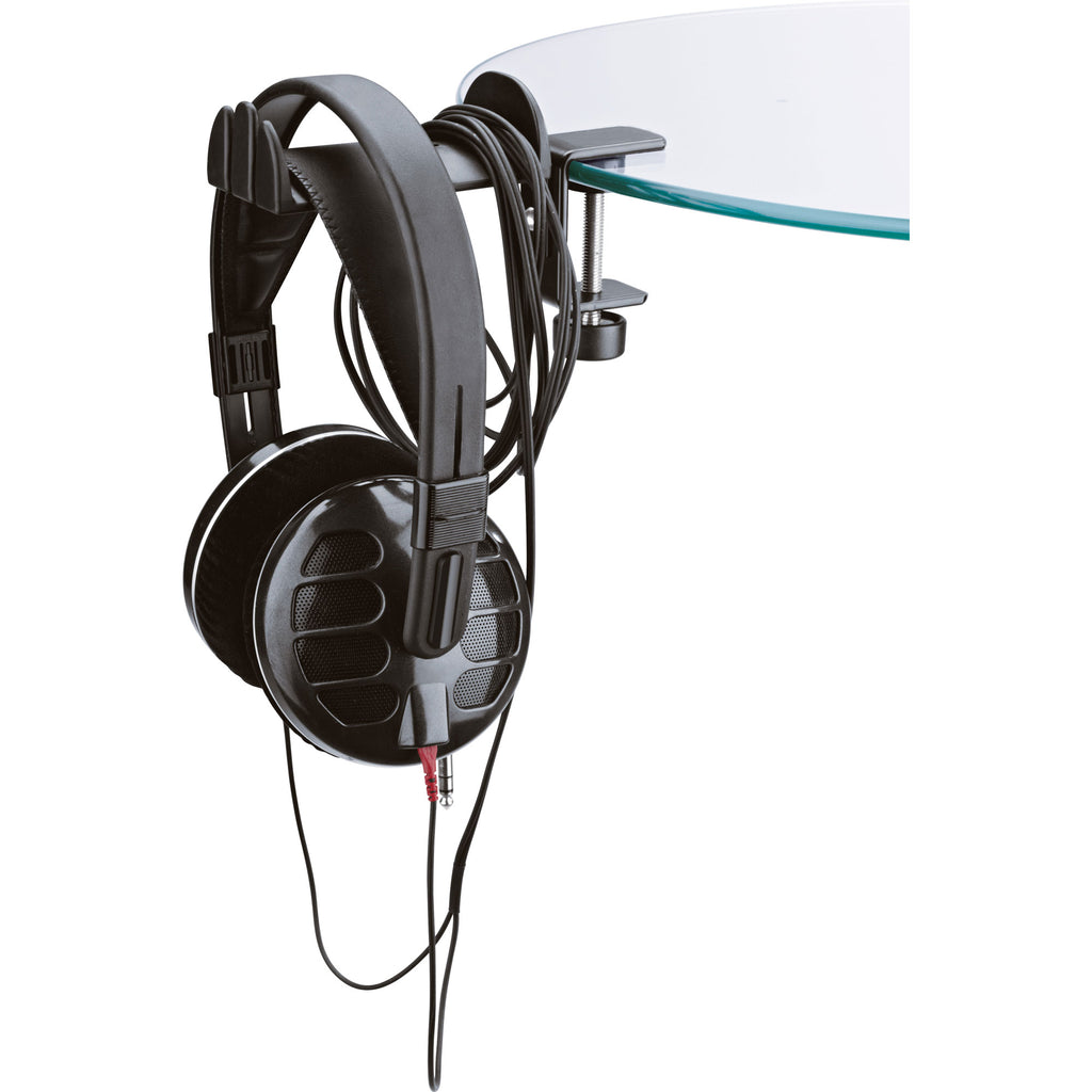 Protective and stable holder covered in soft rubber for 2 standard headphones. In addition, there are grooves on the front of the support arm in which two in-ear-headphones can be hung. The clamp can be extended from 0 to 1.772" allowing it to be mounted on a wide variety of tables, shelves etc.