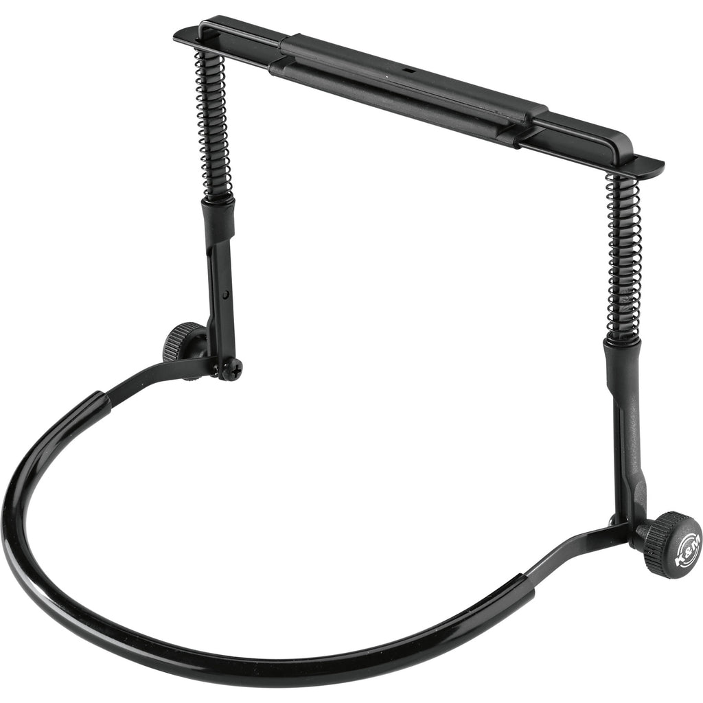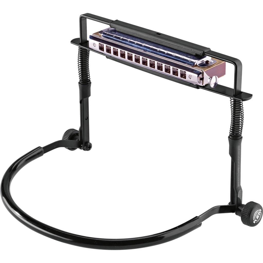 Particularly suitable for blues harmonica models. Molded rubber sections on the support arms hold the instrument securely. Easily adjusted by spring tension and two knurled screws. The neck frame has a soft rubber covering for extra comfort.