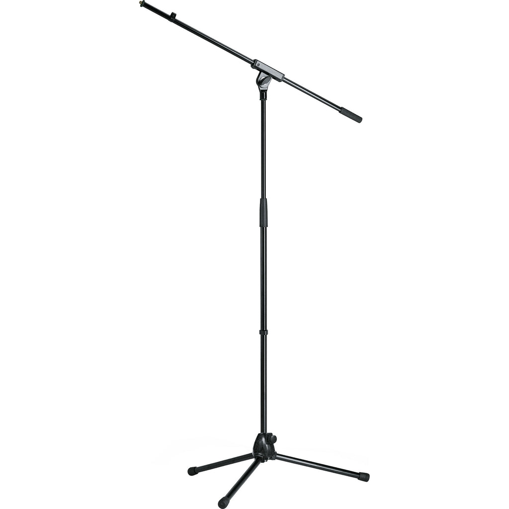 Low-priced all-metal-stand. Consists of tubing assembly, boom arm and zinc die-cast base with long folding legs. Square swivel joint with large wing nut.