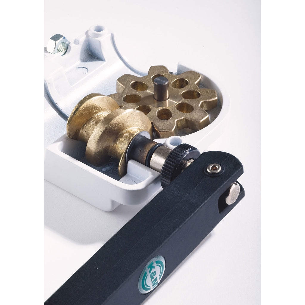 • Special features: patented expanding mandrel system Ring Lock; vibration-free connection due to moveable plastic splints; push-button system and hand crank avoid uncontrolled reverse motion; locking screw provides additional safety; M20 bolt for precise and vertical fit