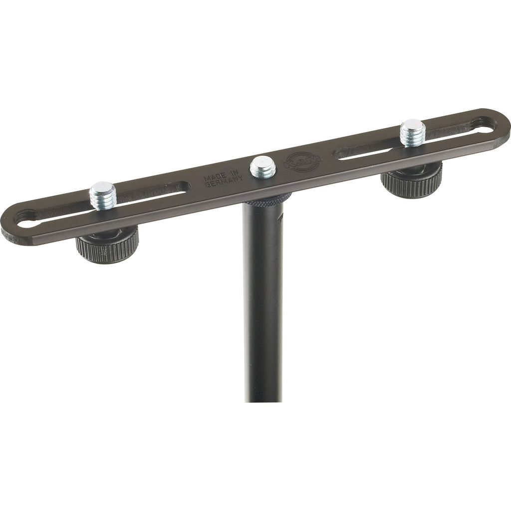 Connects to top of mic stands for holding 2 microphones or boom arms. 5/8" locking screws, adjustable from 2.36 to 6.77".