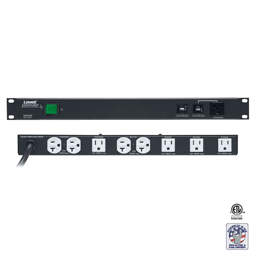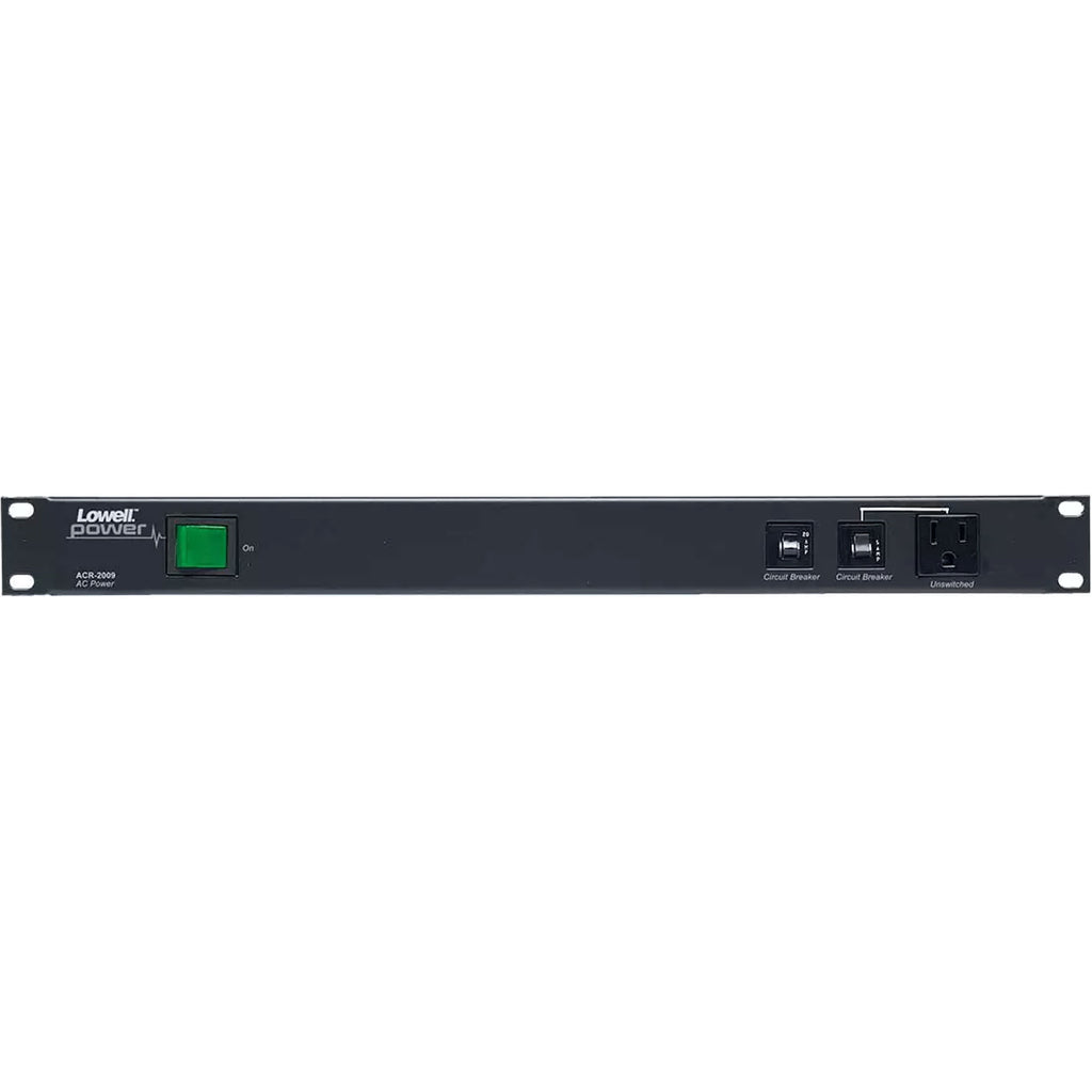 Feature strong family of AC power panels let you select the options and pro- tection criteria you need to meet specifications. All models are ETL Listed as- semblies in a slim rackmount chassis size 19"W x 9"D x 1.75"H (1U). The front panel includes a lighted on/off actuation switch, a 20A system circuit breaker and a receptacle (always on) that is independently protected by a 5A circuit breaker. The rear panel layout has one unswitched duplex outlet, one unswitched single outlet, one switched duplex, three switched single outlets and a 9 foot cord with NEMA 5-20P plug.