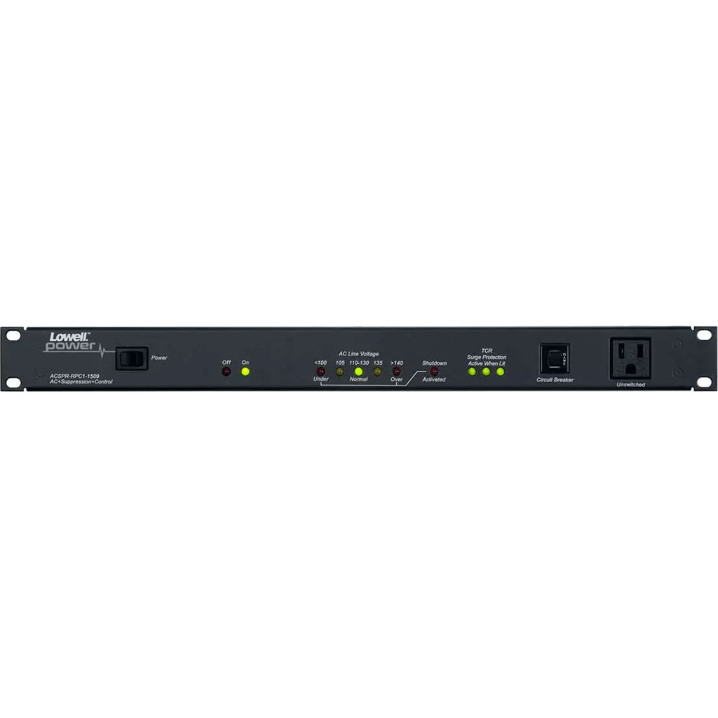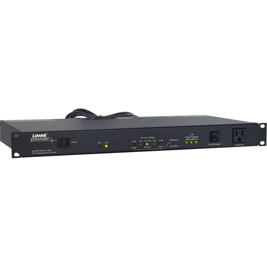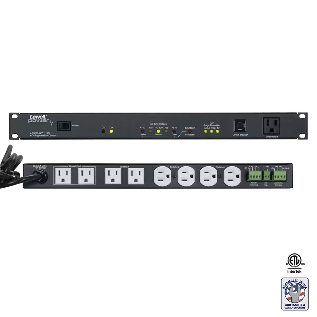 State of the art surge protector with auto-reset over/under voltage protection and remote power control is ideal for a wide range of applications. Model ACSPR-RPC1-1509(K) is ETL Listed in the US and Canada to UL Standard 60065. It is a 15A device that provides safeguarded power distribution from a slim rackmount chassis with three unswitched outlets and six switched outlets that can be remotely controlled. The 19"W x 1-3/4"H (1U) surge suppression device with remote power control and over/under voltage protection features multi-color LEDs for easy visual identification of system status. Termination is by a nine foot cord with NEMA 5- 15P plug. Unit is offered with rocker or key switch activation.