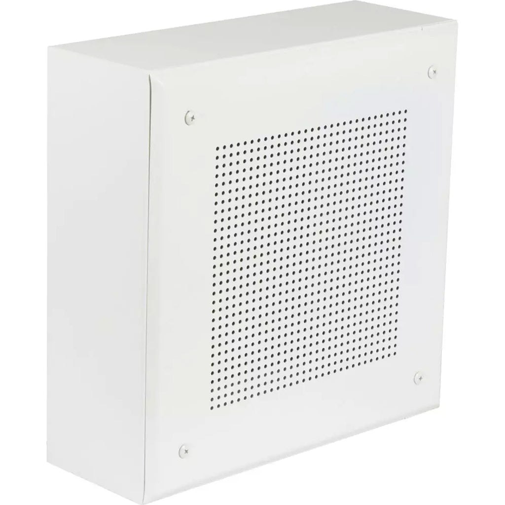 Model BSG-8 is an attractive bi-directional surface baffle for installation of a single 8" speaker to provide bi-directional sound projection in corridor or concourse areas. The surface mount baffle includes two grilles (front and rear) to allow sound to radiate from behind the loudspeaker, as well as the front, achieving greater sound coverage and increased efficiency. The clean, square baffle design is precision formed from 20-gauge steel with welded corners and two pre-mounted (SG-8) steel grilles with welded speaker studs. The baffle features a 2" square opening in one side for wire access and is punched for flush mounting to a standard E.O. box. The baffle may be mounted on the wall or ceiling to provide bi-directional sound projection of a single 8" speaker (order separately). The baffle and grilles are finished in durable white powder epoxy for long-lasting quality appearance.