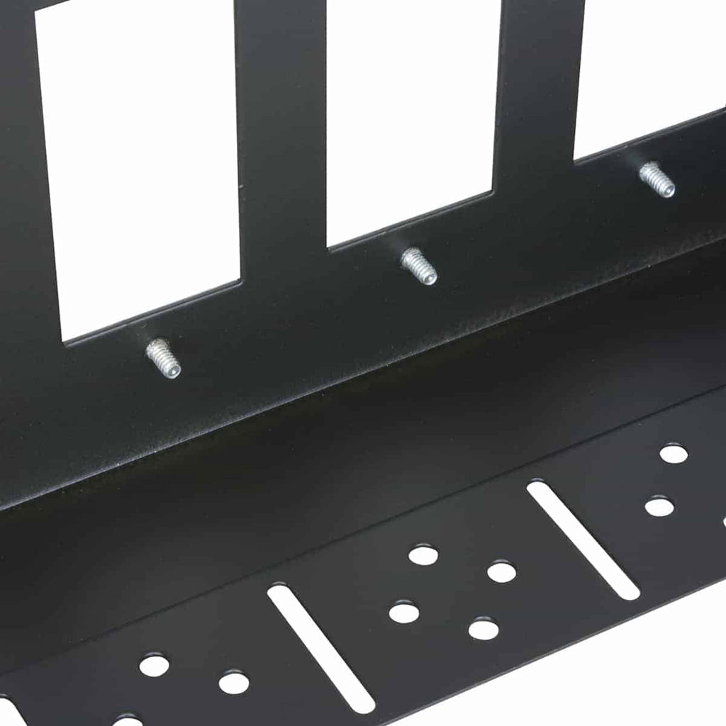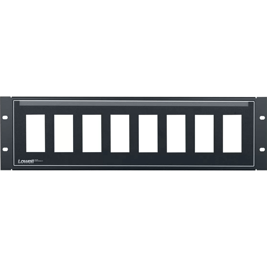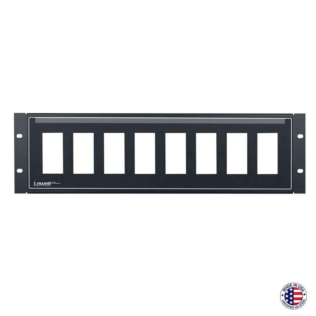 The D8P-ID-3 is a 19" (3U) steel rackmount panel with eight punched open- ings to hold up to eight (1-gang) Decora style devices, and a PocketIDTM label area. The panel uses minimal rack space while providing an organized solution for mounting and identifying low-voltage devices in the front of the rack. It includes a rear lacing flange for wire management, hardware, and a mounted polycarbonate overlay with clear Pocket-ID area for labels. Smooth, semi-gloss, black epoxy finish. Order device controls and filler plates separately.