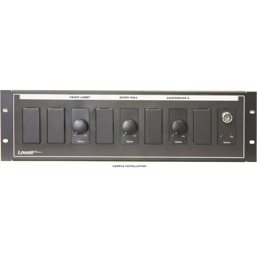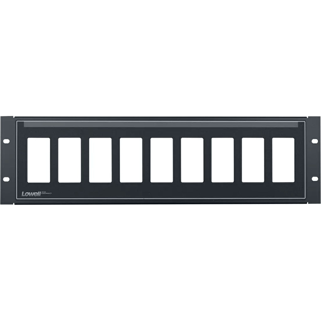 The D9P-ID-3 is a 19" (3U) steel rackmount panel with nine punched openings to hold up to nine Decora style devices (or four wide-body Decora devices mounted in alternate spaces), and a PocketID label area. The panel uses minimal rack space while providing an organized solution for mounting and identifying low-voltage devices in the front of the rack. The panel includes a rear lacing flange for wire management, hardware, and a mounted polycarbonate overlay with clear Pocket-ID area for labels. Smooth, semi-gloss, black epoxy finish. Order device controls and filler plates separately.