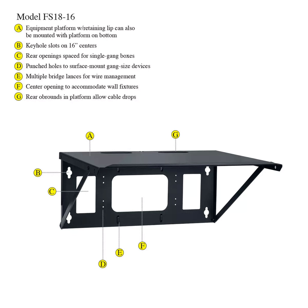 The fully-assembled FS wall shelf ships flat in a compact carton for economical, convenient warehousing. To mount, simply rotate the rear panel 90-degrees so the front panel flanges insert into the rear panel cutouts. The shelf provides secure support for up to 100 lbs. of equipment when properly mounted to a wall. Keyhole mounting slots are on 16" stud centers and are slotted so the shelf can be inverted to meet application requirements.