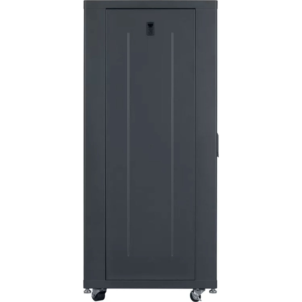 An elegant design made for the high-end decor of boardrooms and home theaters, this ready-to-use rack includes casters, leg levelers, five shelves, five blank panels, two fans, lockable side panels, a rear access cover, and a tempered glass front door. Charcoal Grey textured finish.