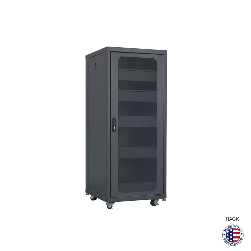 The elegant "LCDR" with smoked grey tempered glass front door is made to fit the high-end decor of executive boardrooms and home theatres. The welded 16-gauge steel frame with charcoal grey textured finish has a solid top with vents and factory-mounted whisper fans already in place. Several 19" panels and vented shelves are installed leaving plenty of room for rackmount equipment. Side panels and a rear access cover can be locked for security or removed for access. Cables can be easily routed through top/bottom holes with inset grommets. The LCDR includes casters for portability plus leg levelers to provide a secure footprint. This ready-to-use, pre-configured EIA/TIA/RoHS compliant rack is available in 18-24 rack units (24 in. depth x 22.3 in. width).