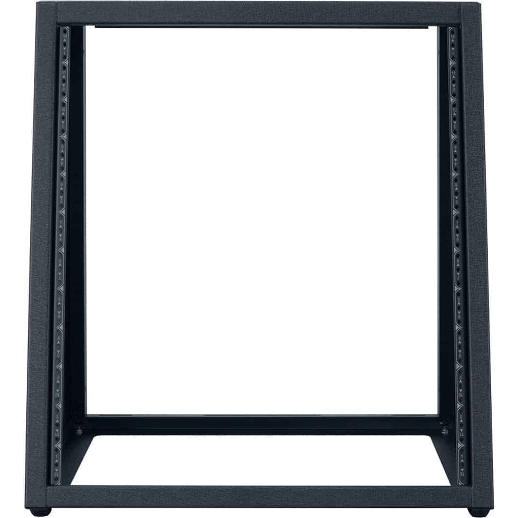 The LDSR-series rack measures 18"D at the base and features a 12-degree slope so equipment can be viewed from a seated position. Sturdy design is 16-gauge certified US steel, with fixed front mounting rails tapped 10-32 and recessed .562" from frame, providing approximately .75" for equipment clearance. Open back allows easy access to rear equipment controls. This rack will not accept a front door so equipment with protruding knobs or patch panel connections is not a problem. Rack includes rubber feet to protect desktop from scratches or you can order the optional protective runner kit (model PRK) for slide-in applications.